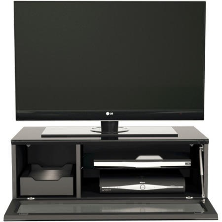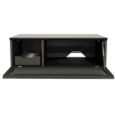 The Element EMT850CB-BLK is a feature rich TV stand with a contemporary, monolithic form design. Store all your AV equipment and blu-ray collection behind the fold-down front door with a remote-control friendly glass centre window.