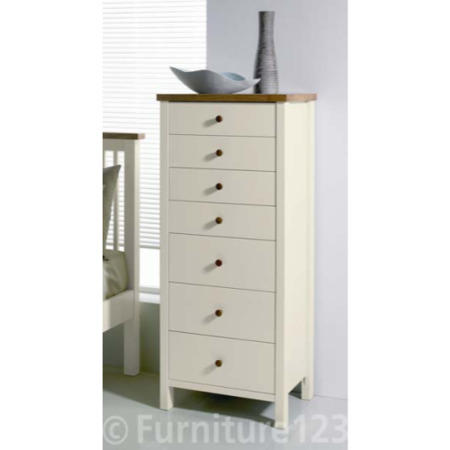 This smartly presented Atlantis Two Tone 7 Drawer Tall Chest has got seven drawers to accommodate your clothing and all the bits and bobs while the top is a perfect spot for any decorative items. Thanks to its narrow and tall design it provides ample storage space without taking up too much room. The oak finish top features exposed mortise and tenon joints and combines beautifully with the ivory finish of the carcase while the matching handles complete the look. With its chunky proportions, stunning wood grain and charming design, this chest of drawers will be a sumptuous addition to your bedroom furniture.