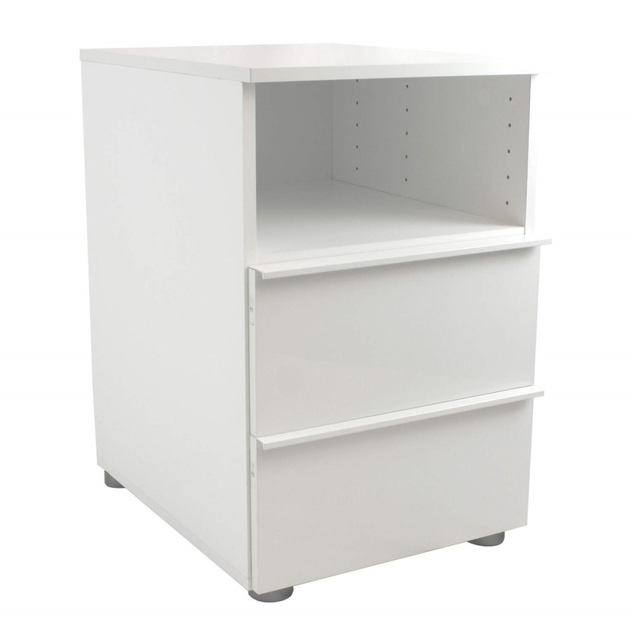 This minimalist two drawer bedside table is finished in white laminate with contemporary high gloss white drawer fronts, giving a clean, modern feel to your space. Topped off with integrated handles along the top of each drawer the simplistic look is enhanced.
