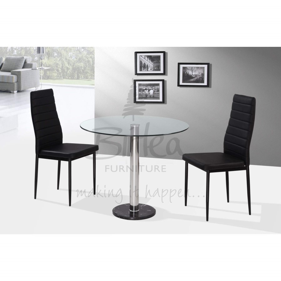 The Birlea Romford Dining Set range features modern contemporary designs and is the perfect space saver. Available in black or white to suit your dining room. The Romford Black Dining Set features a compact circular glass dining table with chrome pedestal and black marble base and is perfect for a small flat . This set also comes with 2 dining chairs in upholstered black PU leather with black legs.