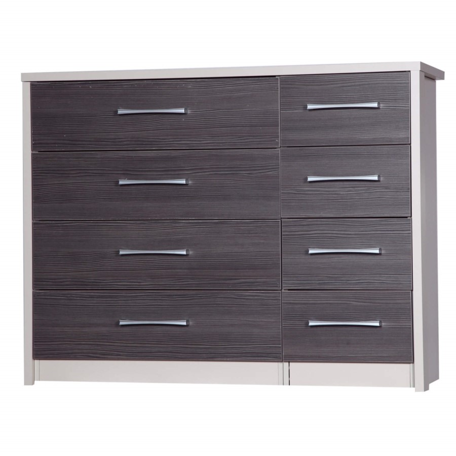 The Odessa 4 Drawer Double Chest in Cream with Grey Wood Grain Effect offers you eight drawers of storage for your bedroom, with space for both smaller and larger items. These drawers are finished in the excellent grey wood grain effect of the Odessa range which perfectly complements the cream of the body. Furthermore they are finished with brushed steel handles that showcase the quality of this piece.