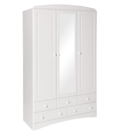 The Scandi three door wardrobe from Furniture To Go will be a beautiful feature in the bedroom. A solid design standing tall in the bedroom. The three doors have simple indented lines adding that little extra detail. The double doors open up to reveal a single hanging rail to hold all your clothes, nice and neat. The single door also hides a hanging rail, great for separating your coats and jackets from your regular clothes. There's two drawers at the base of the wardrobe for extra storage, ideal for jumpers, bedding or lots of accessories, and three smaller drawers above offering great organisation, perfect for smaller accessories. The middle door has a fitted mirror, stylish and practical. The crisp white with the smooth lacquer finish offers the versatile style which allows the piece to be suited in any setting.