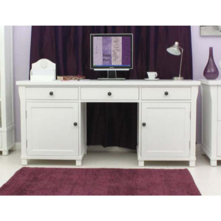 Perfectly formed and finished, the Hampton White Solid Ash Twin Pedestal Hideaway Desk will house all your work equipment. Shelving stores CPUs and rooters while the central drawer converts into a desktop that is all neatly hidden from view via doors. If that wasn't tidy enough, the cable holes organise unsightly wires.