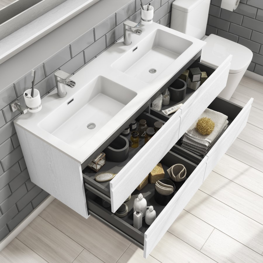 Modernise your bathroom with the Boston Wall Hung Double Vanity Unit with Basin. Finished in a white wood effect, the natural tones and colour will help add a contemporary feel to any bathroom.