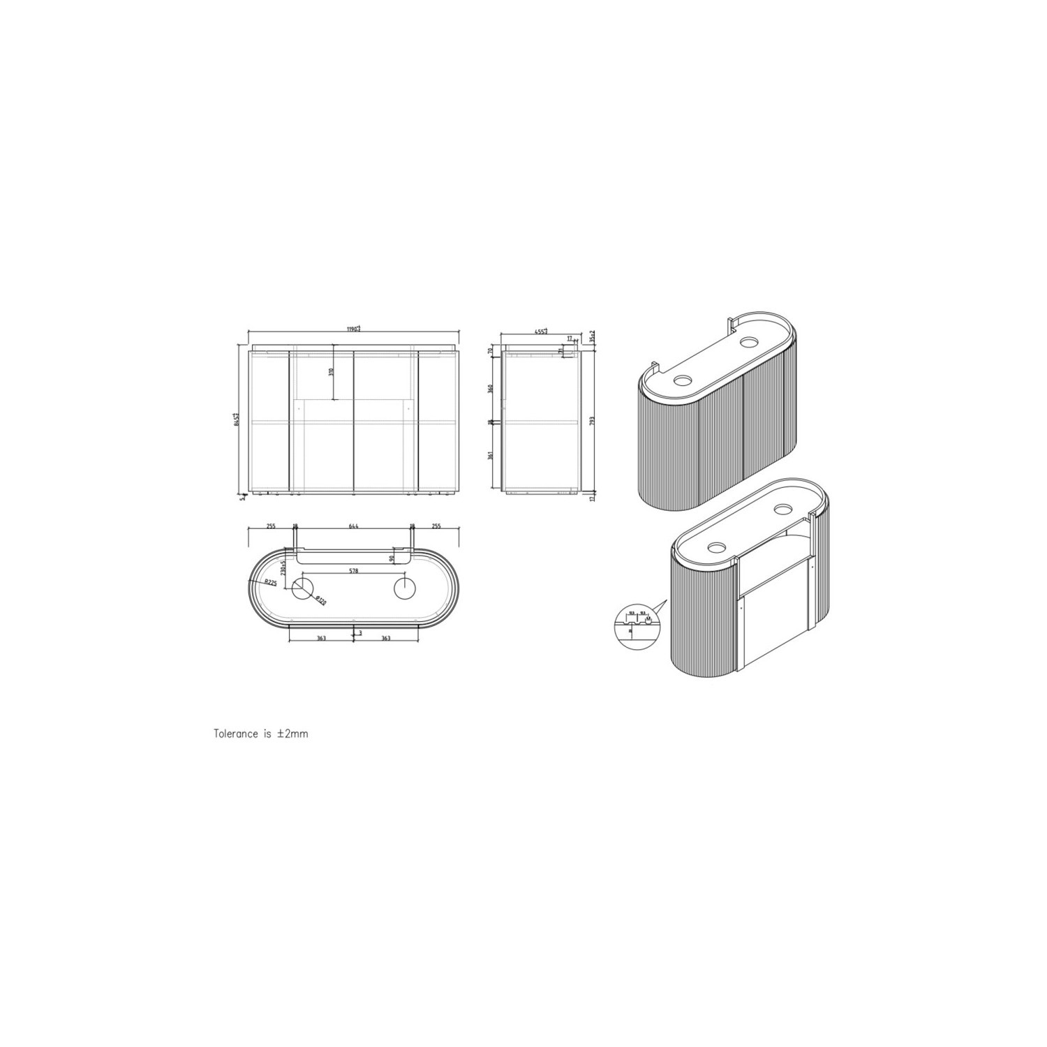 Curved Fluted Double Vanity Design: Freestanding double basin vanity unit with a modern curved walnut wood effect veneer fluted finish, adding texture and softness to any contemporary bathroom.