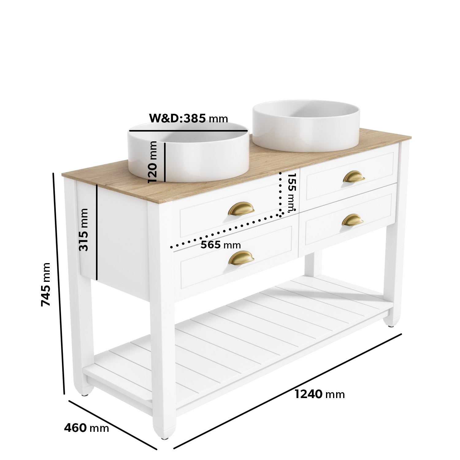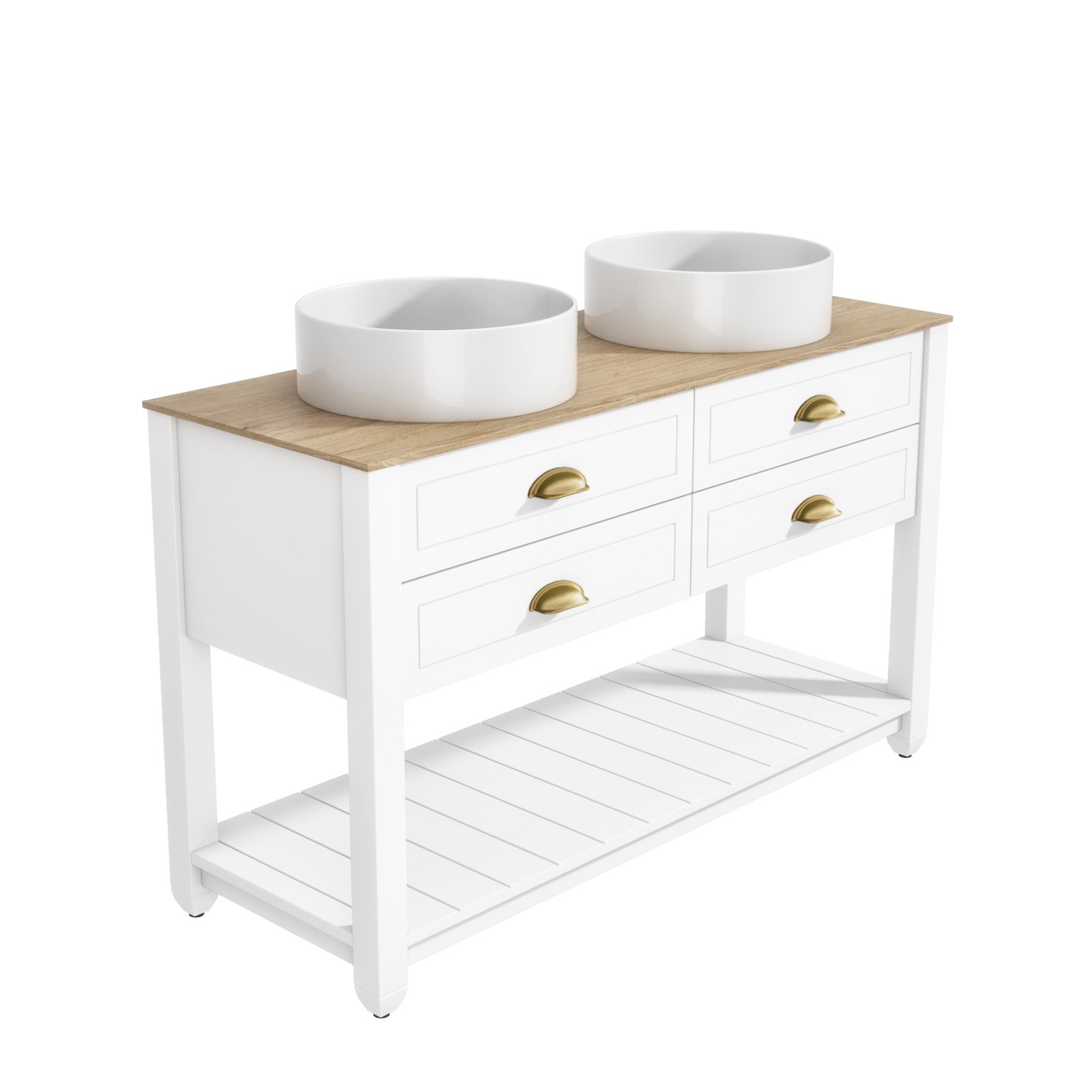 This timeless design will update your bathroom and be the perfect centrepiece with its matt white finish and wood effect top that makes the brushed brass cup pull handles pop. It has a traditional meets modern styling that will look great in any bathroom and the neutral white and black sits well in any colour scheme.