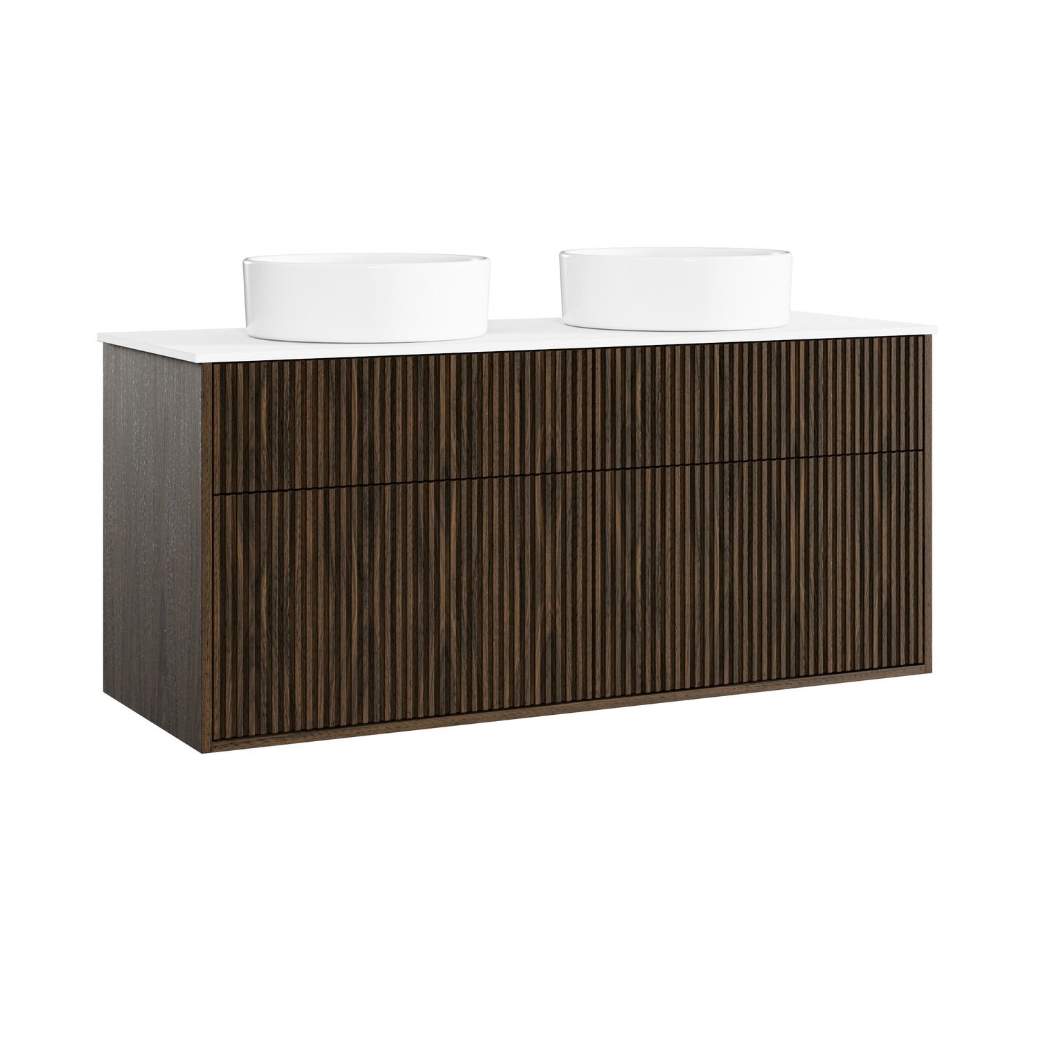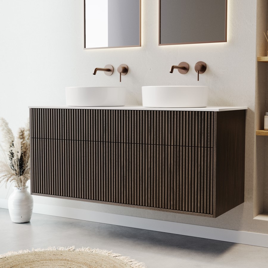 Upgrade your bathroom with our walnut wood effect fluted Matira 1250mm wall hung double vanity unit bringing a contemporary luxe style to your home. The floating vanity unit offers a space saving solution, opening up your floor space, whilst providing ample storage. The four deep fluted drawers with push to open and soft closing mechanisms add a premium touch to your bathroom.