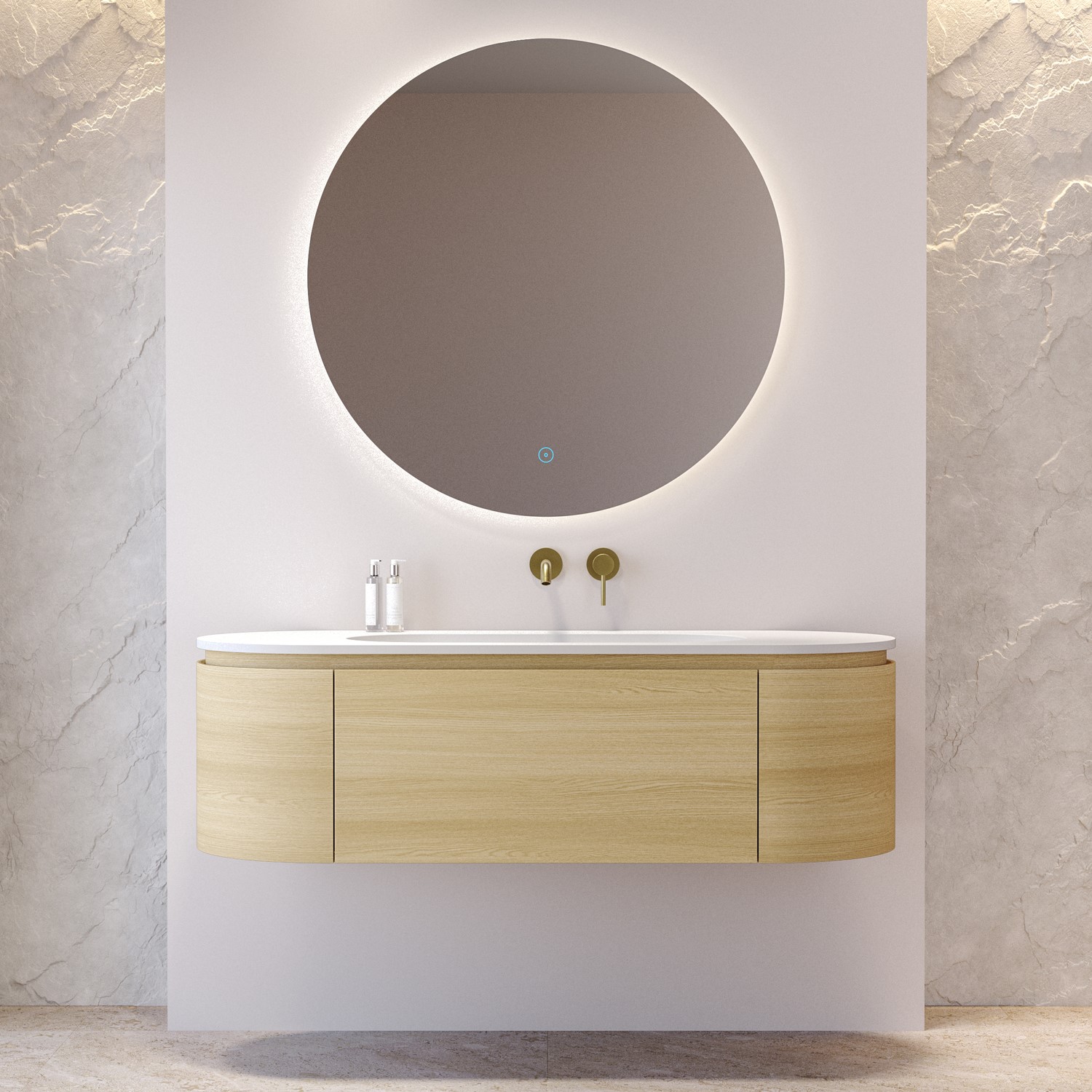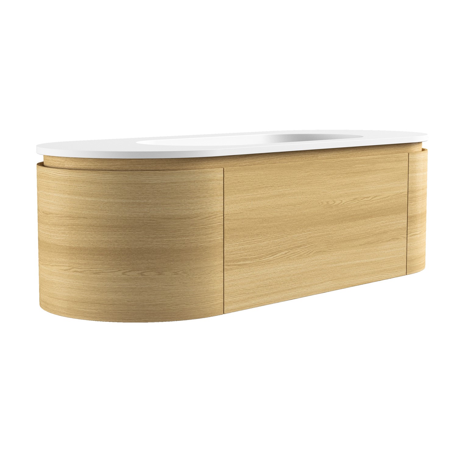 A refined expression of modern luxury, the Cali 1400mm wall hung vanity unit is designed to anchor the bathroom with sculptural presence and quiet sophistication. Its elongated, softly curved form is wrapped in a natural oak effect finish, delivering a clean, contemporary profile. Every detail is intentional—included the concealed storage drawer that preserves the vanity’s architectural purity - opening with the concealed chamfered edged handle and closing with a soft close mechanism to ensure an extra touch of luxury. The floating installation enhances the vanities statement quality, whilst also opening up floor space to create the feeling of a more open and larger bathroom.