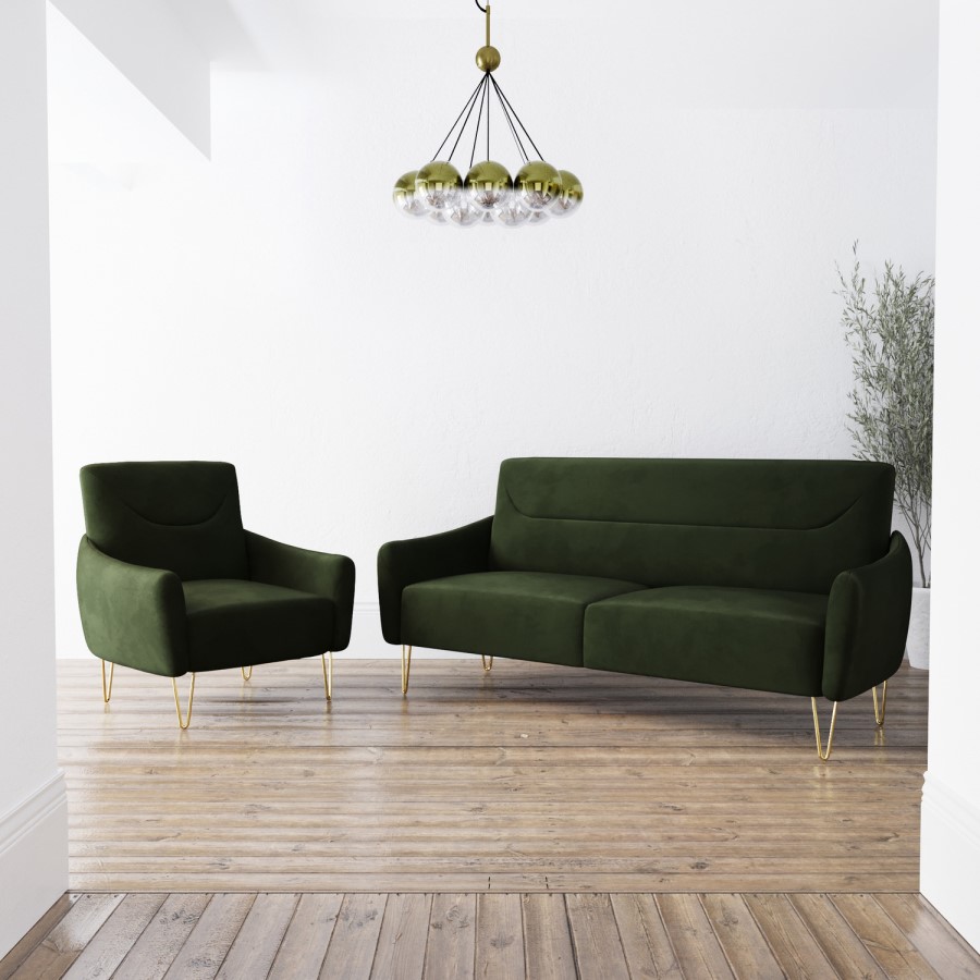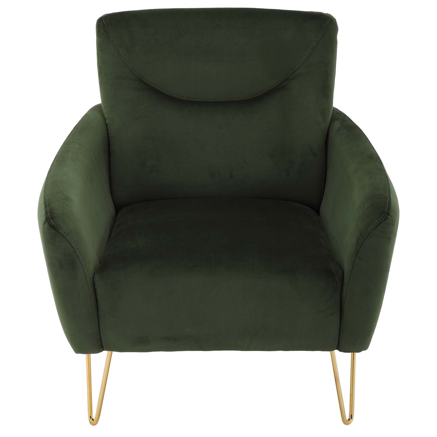 Upgrade your living space with this luxurious green velvet armchair. This stylish chair is filled with soft spongey foam and comes with four gold hairpin legs to attach. With comfortable deep seating and the added touch of detailed stitching, this versatile piece will look fab in any home setting.