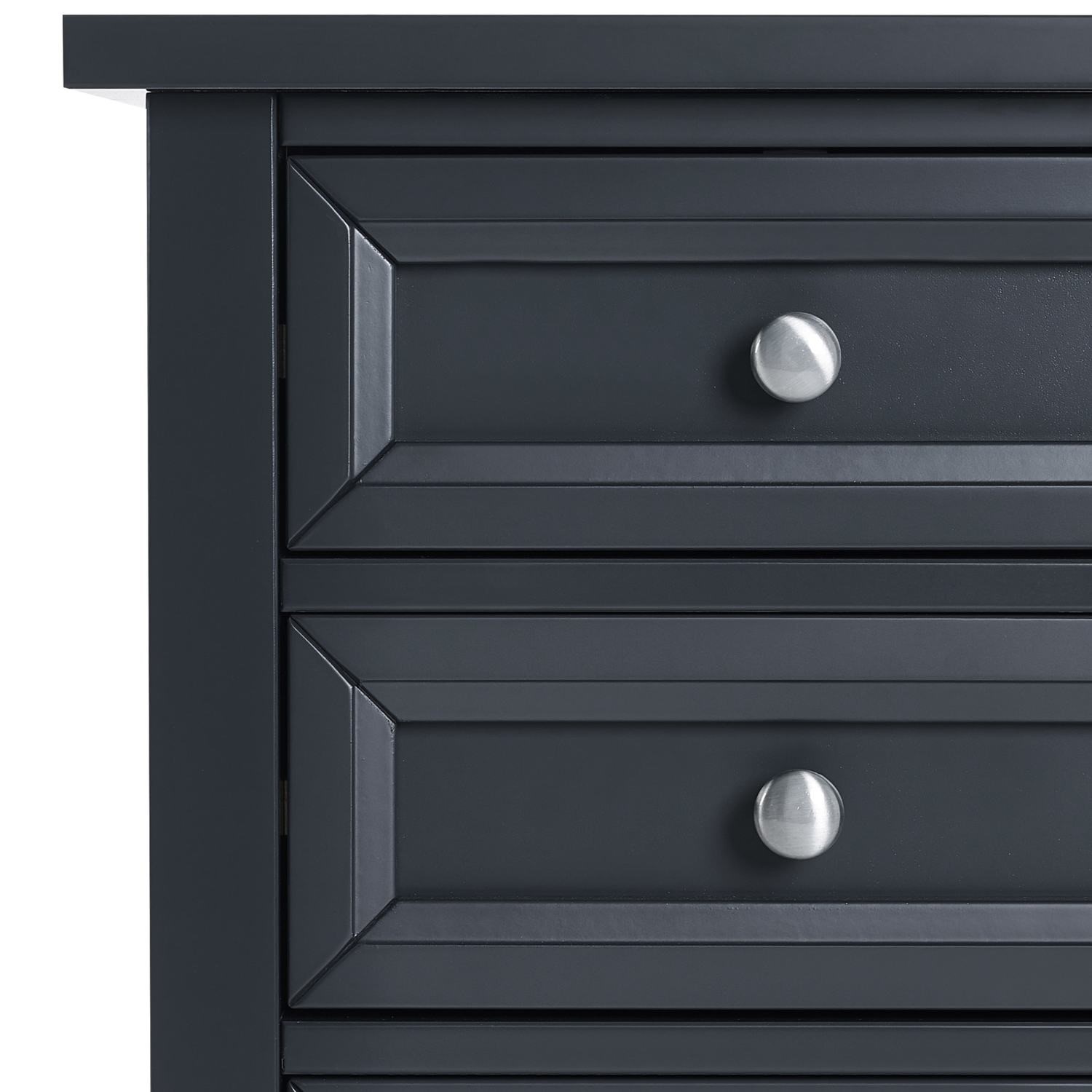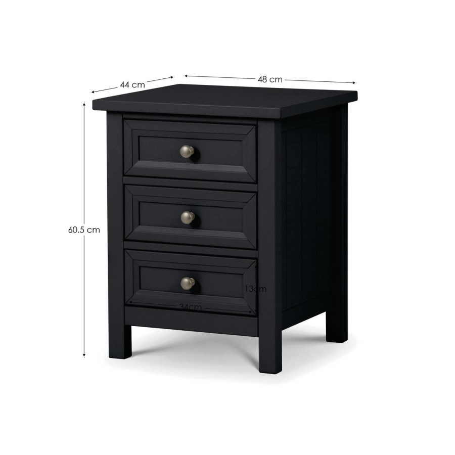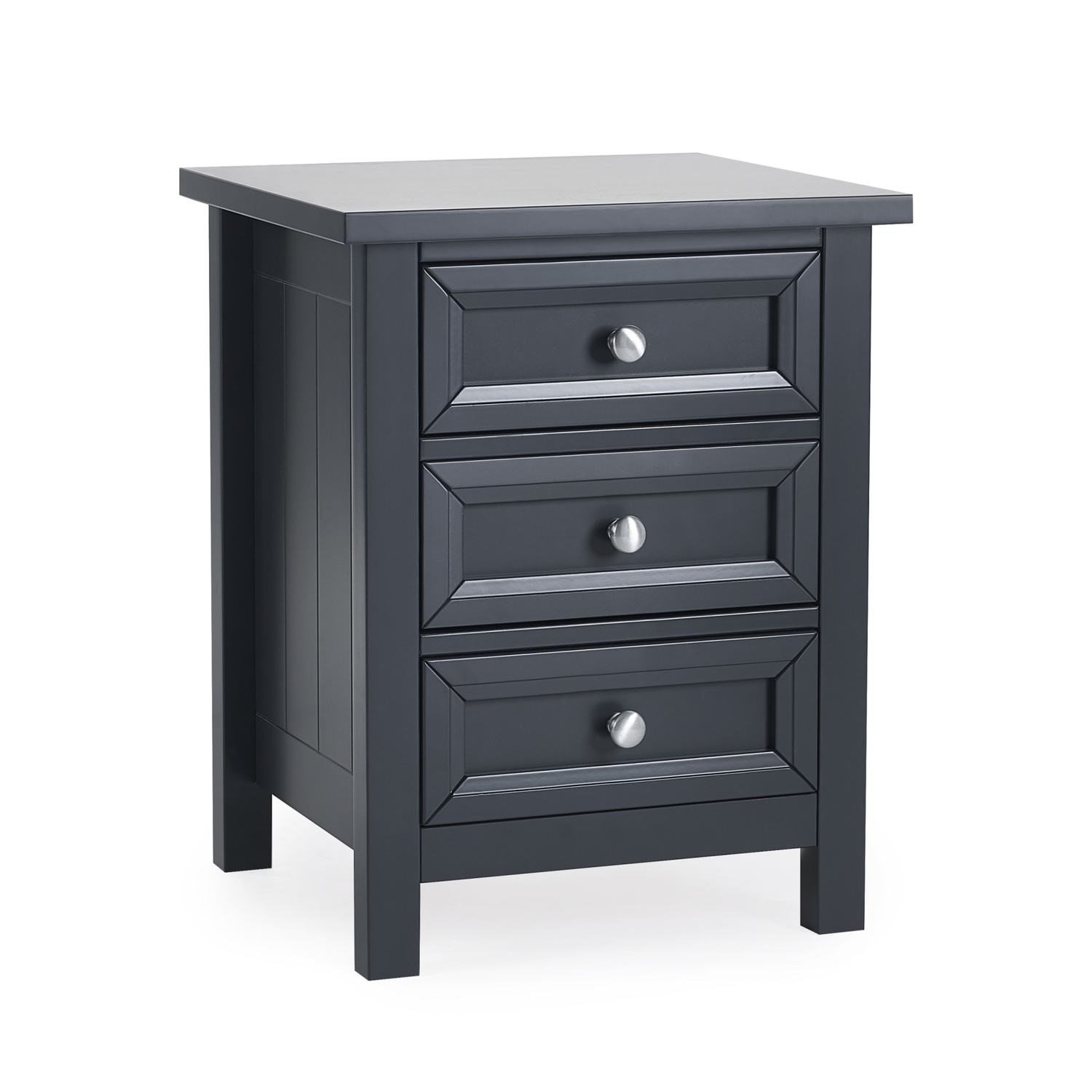 Maine is an elegant New England-style range of bedroom furniture. The combination of exquisite anthracite lacquered finish with characteristic side panelling and detailed chamfered cabinetry makes for a soothing and refined aesthetic with timeless appeal, while delicate pewter handles add the perfect finishing touch. The Maine 3-drawer bedside offers three large storage drawers.