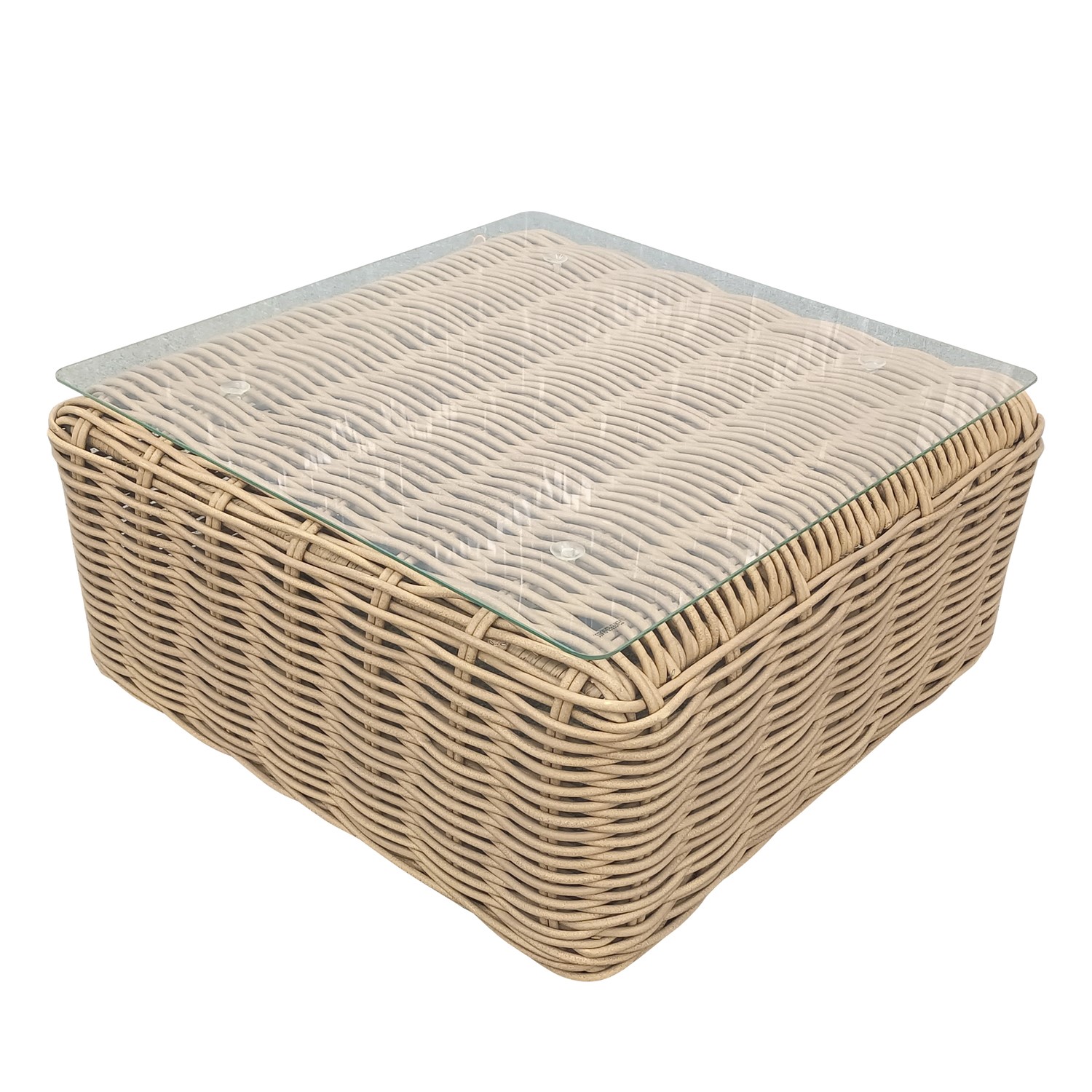 - Material: Synthetic woven rattan, steel (frames), fabric (upholstery), foam fill (cushions) and tempered glass (tabletop)