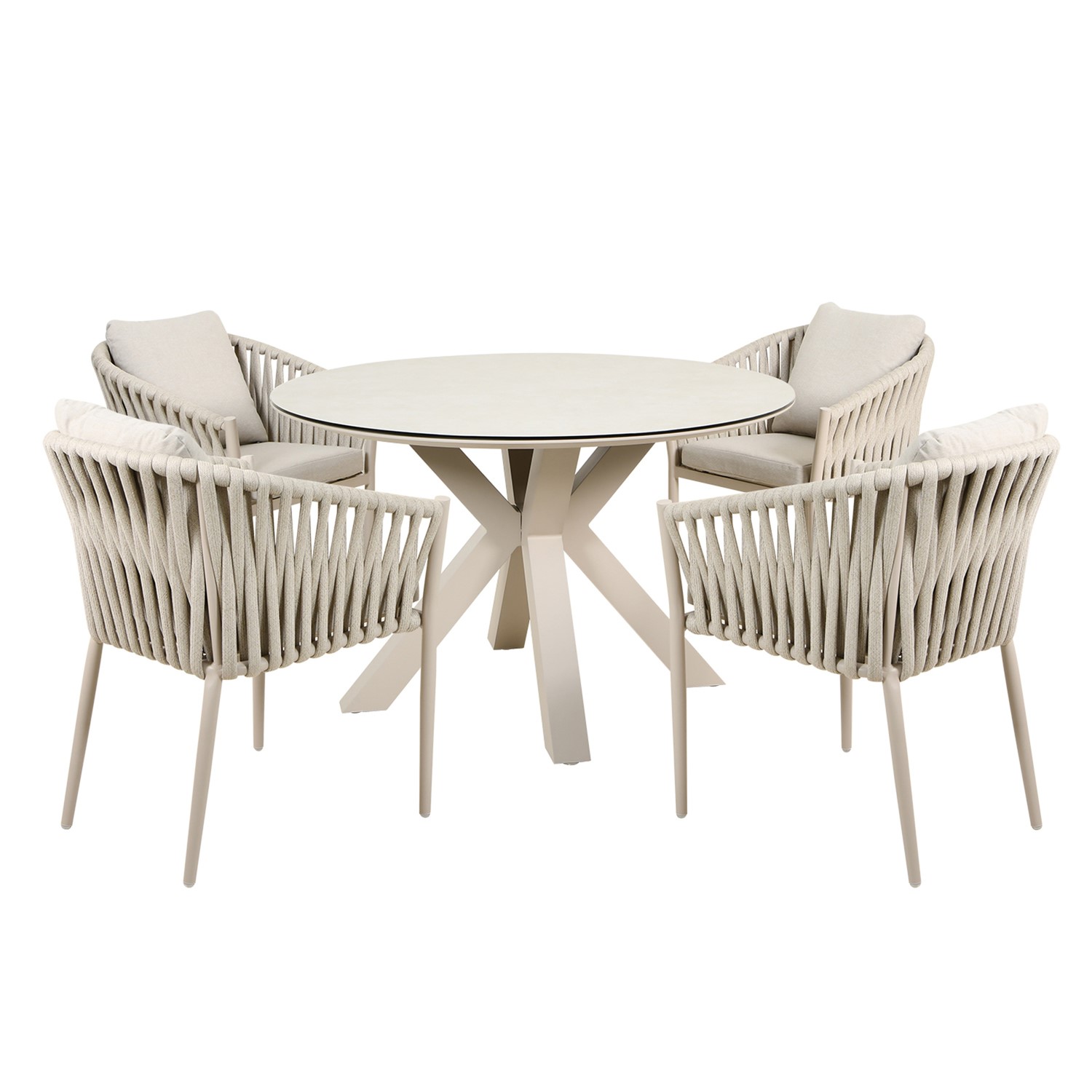 Transform your garden, patio, or balcony into a stylish outdoor space with this beautifully designed 4-seater dining set. It features a contemporary round tempered glass-topped table and four comfortable rope-weave chairs with plush seat cushions. This set is perfect for al fresco dining, morning coffees, or evening drinks with family and friends and even includes a waterproof cover to protect your furniture all year round.