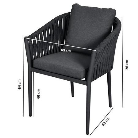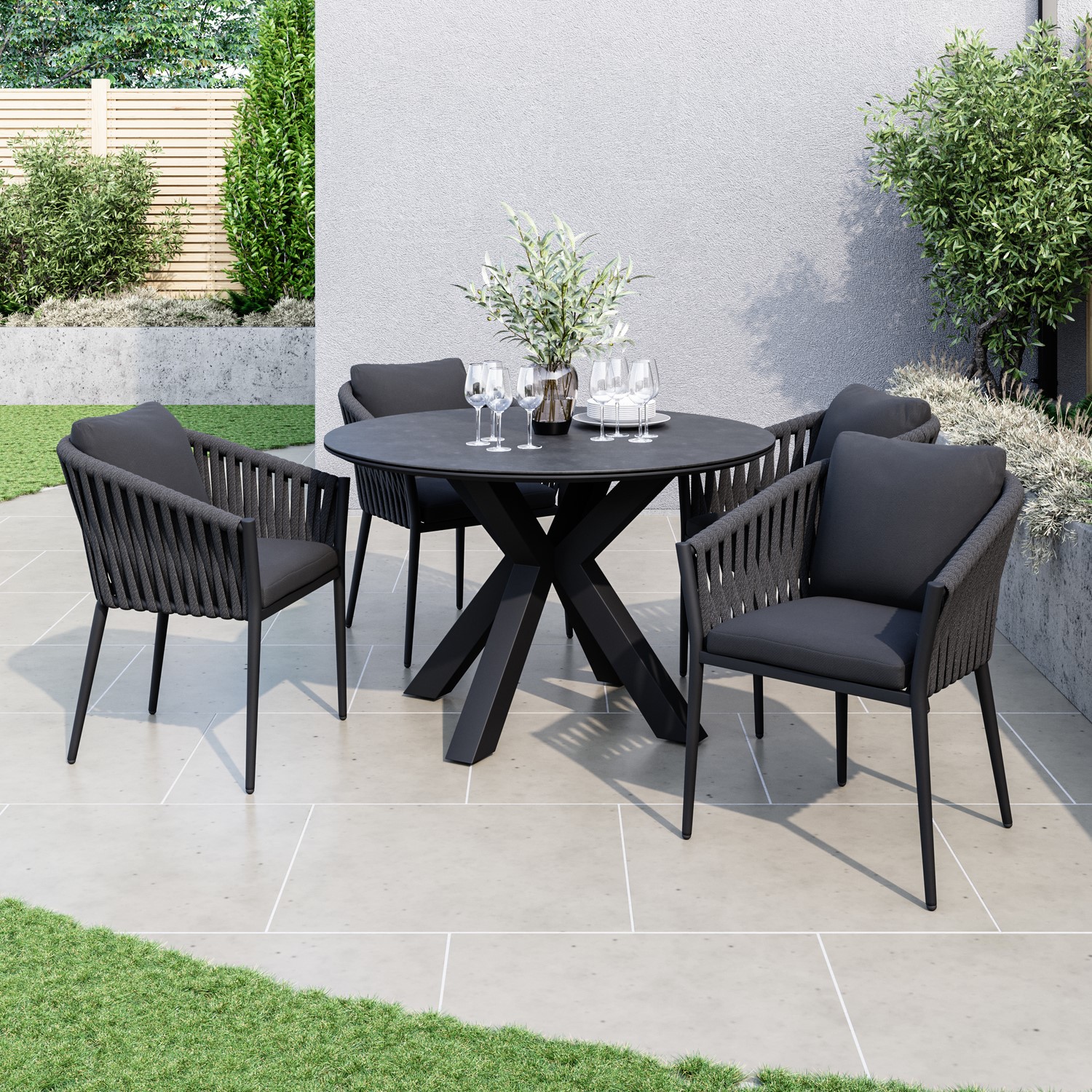 Designed to bring contemporary elegance to your outdoor space, this 5-piece dining set pairs a sleek round table with four beautifully crafted rope armchairs. The deep charcoal tones create a refined, modern aesthetic that complements patios, decking, and garden spaces alike. The intricately woven rope chair backs offer both visual texture and supportive comfort, while the included cushions provide a soft place to sit and unwind. The sturdy pedestal table base adds architectural interest and dependable stability, making this set as practical as it is stylish. Perfect for relaxed family meals or entertaining friends, it’s a sophisticated centrepiece for any outdoor setting.