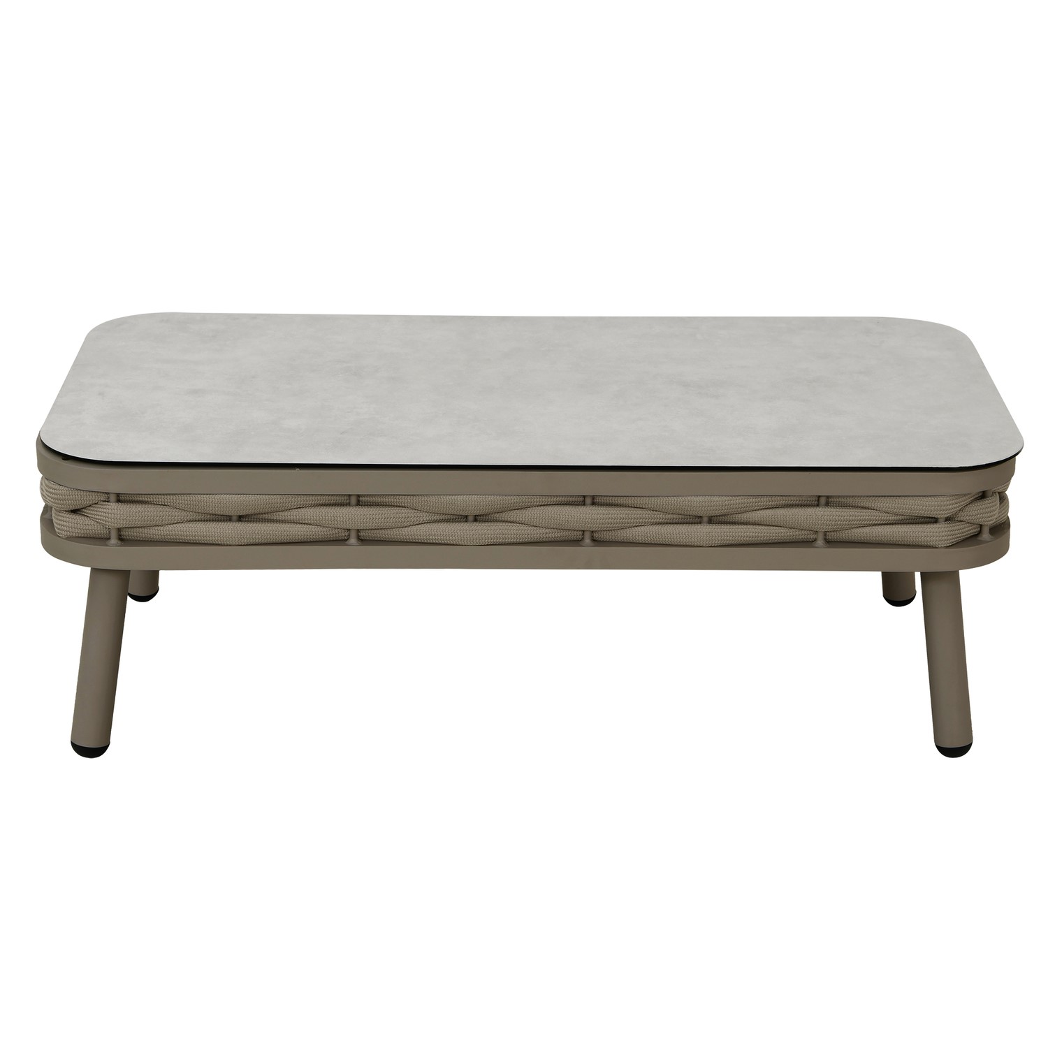 - Finish: Powder coated, rope weaving, printed tempered glass tabletop and upholstery
