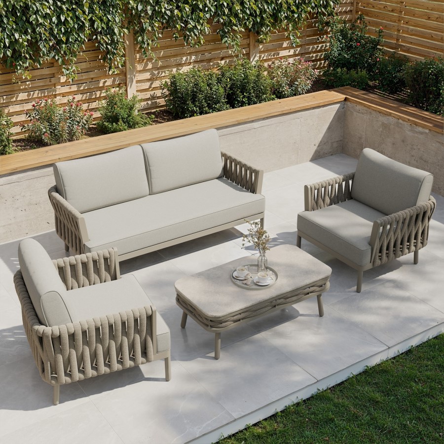 Update your outdoor seating area with our cosy 4-seater sofa set, designed for comfort, durability, and modern elegance. It features a low-maintenance coffee table with a tempered glass tabletop, a 2-seater sofa, and two armchairs. The seating boasts a continuous rope-weave back and sides, offering the upmost comfort. This inviting outdoor sofa set is both as stylish as it is practical and perfect for relaxed dining and entertaining. It even includes a waterproof cover to protect your furniture season after season.