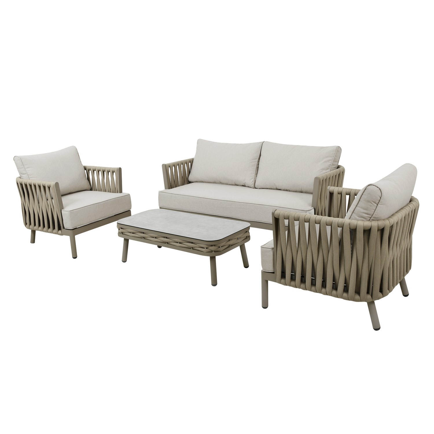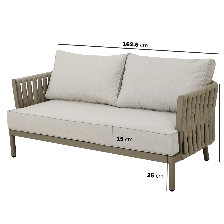 - Material: Synthetic woven rope, powder coated aluminium (table / chair frames), glass (tabletop), polyester fabric (upholstery) and foam filled (cushions)