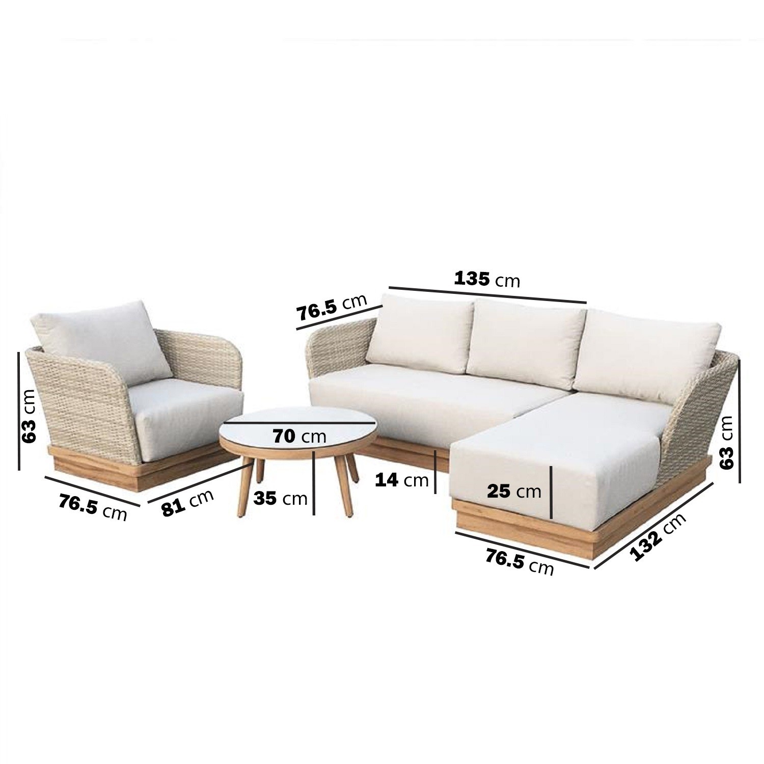 This contemporary garden lounge set brings indoor-style comfort to your outdoor space. Featuring a generously sized corner sofa with an extended chaise, a matching armchair and a round coffee table, it creates the perfect setting for relaxing, socialising or enjoying sunny afternoons. The natural woven rattan-style detailing contrasts beautifully with the sturdy wood-effect base, delivering a modern yet timeless look. Deep, neutral-toned cushions enhance both comfort and style, making this set a sophisticated centrepiece for patios, decking or garden rooms. Designed for both practicality and visual appeal, it transforms your outdoor area into a welcoming extension of your home.