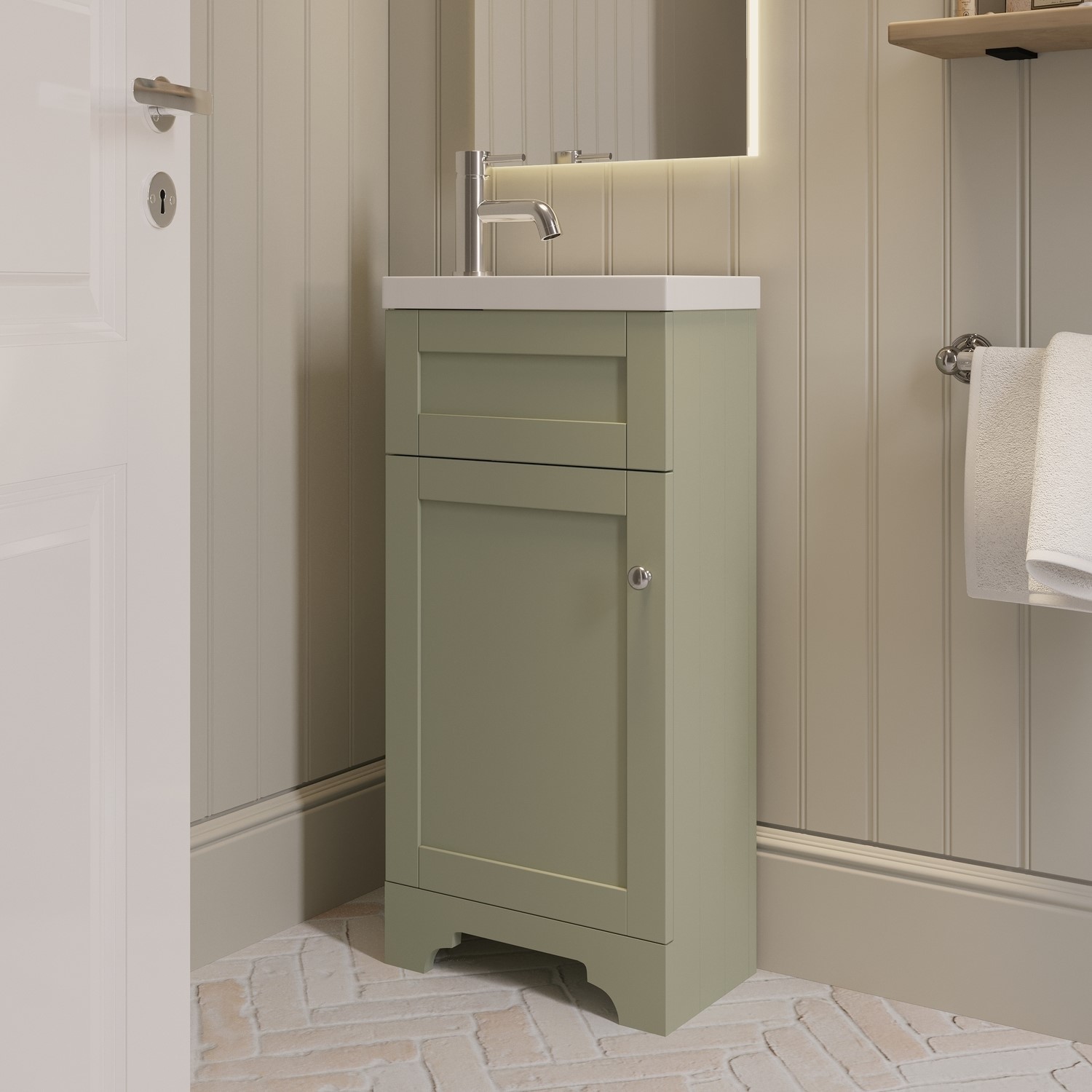 Transform your bathroom with this charming Baxenden freestanding 400mm vanity unit, finished in a trendy matt sage. The traditional styling features classic tongue-and-groove side panelling, shaker doors and ornate front skirting details to add a feature piece to your bathroom. This vanity unit makes brilliant use of smaller spaces with its 226mm depth whilst providing essential storage, making it perfect for ensuites or cloakrooms. Not only is the door opening configurable to suit either a left hand or right hand opening, the basin can also be fitted to suit your tap placement preference - either on the left or right hand side.