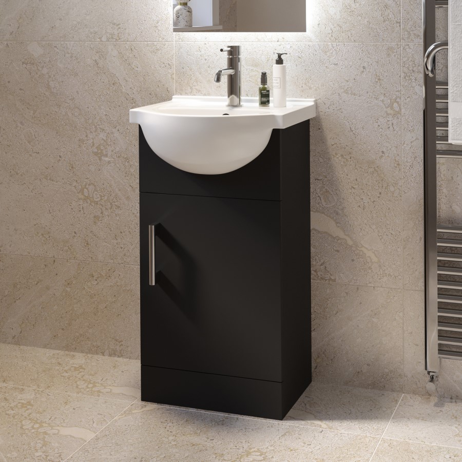 Elevate your bathroom with this modern floorstanding 455mm Classic matt black basin vanity unit, designed to offer both style and everyday practicality. With its clean, minimalist lines and smooth matt black finish, this design brings a bold yet understated presence to contemporary bathrooms. The semi recessed basin provides a luxurious curved design that sits comfortably within the unit while offering deep wash space and countertop space. The ceramic basin features a luxurious, crisp white finish that not only brightens your space but is designed for everyday practicality making cleaning quick and easy. It includes one central pre-drilled tap hole, making it suitable for a cloakroom mono basin mixer tap of your choice, and features a round chrome overflow cover to complete the look.