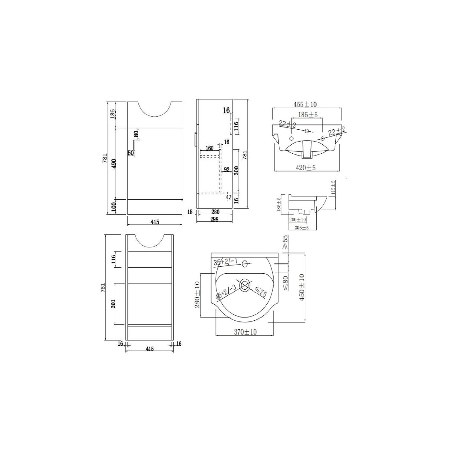- Overall Basin Vanity Dimensions (including basin): H840 x W455 x D 450 mm (the vanity footprint is 415mm, however the basin overhang brings the total width to 455mm and depth to 450mm)