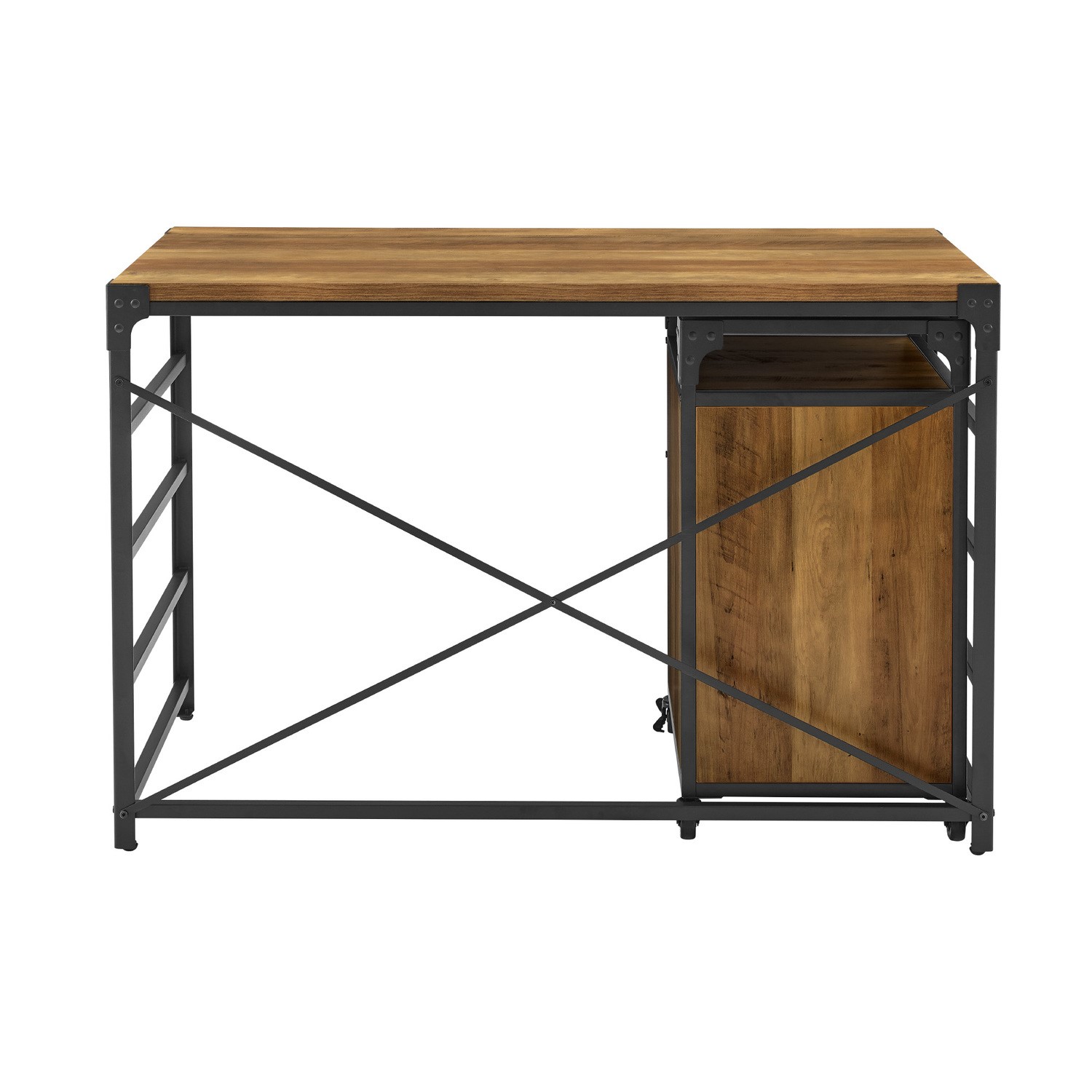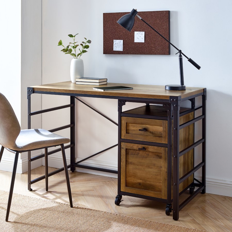 Cozy up in your home office for a get-stuff-done-day with this inviting piece that perfectly accents your modern farmhouse styled home. The industrial-inspired powder coated steel accents and smooth black hardware complement the warm wood texture of the angle iron desk, and the X-back design and ladder siding plays up its modern vibe. Sip your morning cup of coffee atop its durable laminate-coated surface, and file to your heart’s content with the accompanying 2-drawer filing cabinet. Roll the storage unit out to create a spacious work environment, or tuck it snugly under the desk for optimal organization.