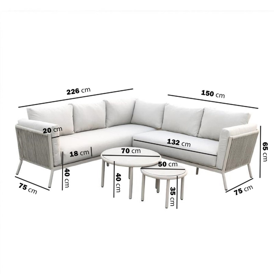 This outdoor beige corner set combines modern design with relaxed comfort, making it a stylish addition to any garden or patio. The deep-seated corner sofa is generously cushioned for all-day lounging, while the woven rope detailing on the sides adds texture and a premium outdoor feel. Finished in a soft neutral palette, the set blends effortlessly into contemporary and coastal-inspired spaces. Complete with two coordinating round coffee tables, it offers both practicality and understated elegance for entertaining or unwinding outdoors.