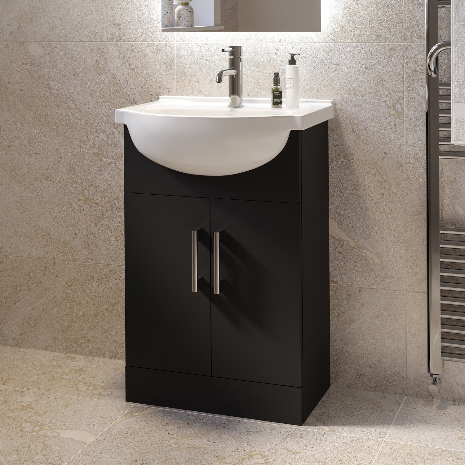 Elevate your bathroom with this modern floorstanding 560mm Classic matt black basin vanity unit, designed to offer both style and everyday practicality. With its clean, minimalist and smooth matt black finish, this design brings a bold yet understated presence to contemporary bathrooms. The semi recessed basin provides a luxurious curved design that sits comfortably within the unit while offering deep wash space. The ceramic basin features a luxurious, crisp gloss-white finish that not only brightens your space but is designed for everyday practicality making cleaning quick and easy. It includes one central pre-drilled tap hole, making it suitable for a mono basin mixer tap of your choice, and features a round chrome overflow cover to complete the look.