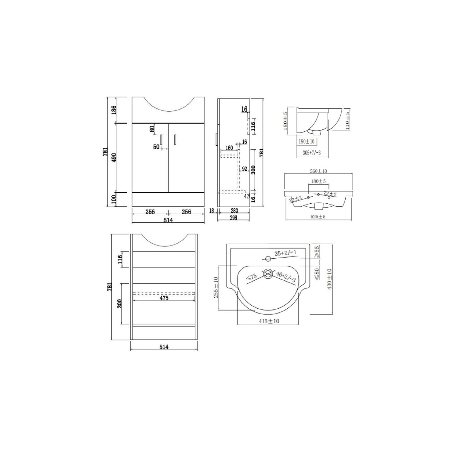 - Overall Basin Vanity Dimensions (including basin): H840 x W560 x D 430 mm (the vanity footprint is 514mm, however the basin overhang brings the total width to 560mm and depth to 430mm)