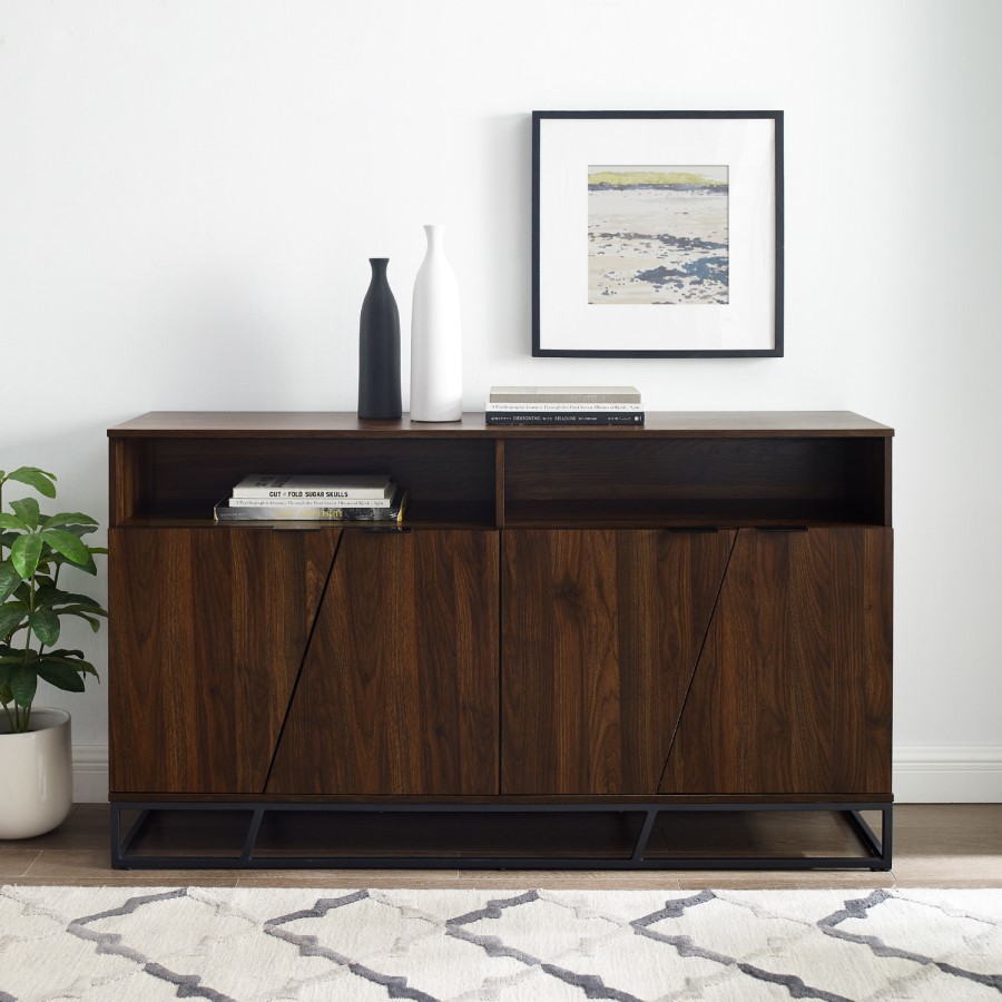 Add some stylish storage to your space with this modern 4 door sideboard. Designed with both style and practicality in mind, this sideboard features four asymmetrical angled doors for all your closed storage needs, and also two open storage cubbies for your keys, valuables, and knick-knacks. The perfect addition to any contemporary interior, this console is available in rustic oak, walnut, and grey wood finishes, and has finger pulls instead of handles for a sleek, minimal feel. The modern open metal base is both durable and design-led, giving the storage unit a hint of industrial style, and making it sturdy. This versatile piece would be equally at home in your living room, dining room, hall, or home office space to meet all your organisation and storage needs.