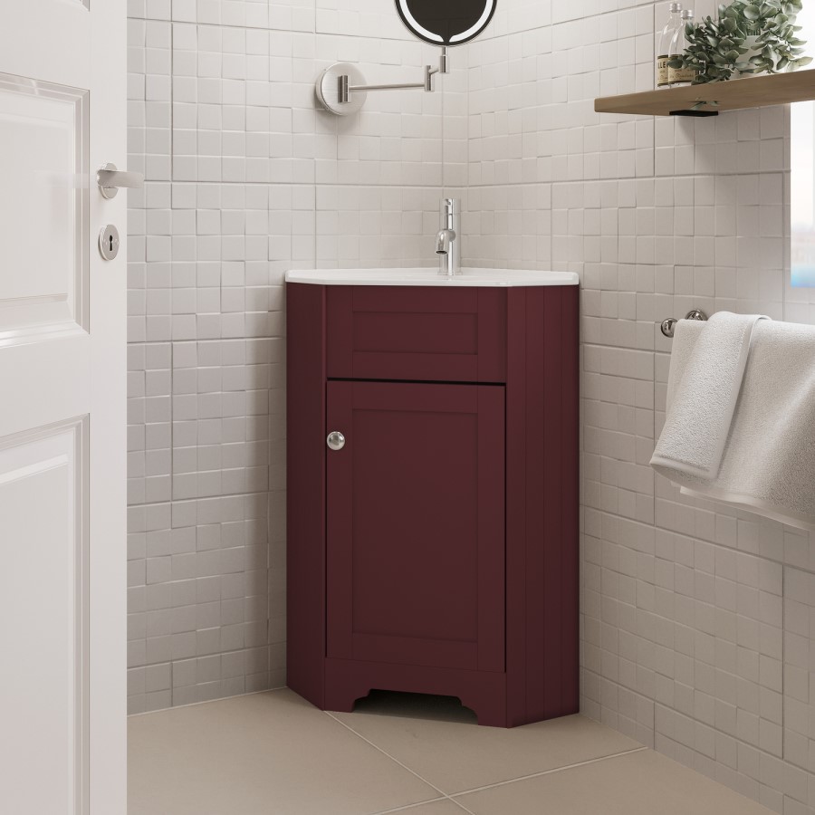 Transform your bathroom with this charming Baxenden 580mm freestanding corner vanity unit, finished in a stylish matt burgundy . The traditional styling features classic tongue-and-groove side panelling, shaker door and ornate front skirting details to add a feature piece to your bathroom. This floor standing vanity unit makes brilliant use of compact spaces, tucking neatly into corners whilst providing essential storage, making it perfect for ensuites or cloakrooms. This vanity comes with a corner ceramic inset basin, finished in a high quality white gloss to make cleaning a breeze and ensure durability. A predrilled tap hole is included, so you are free to add a cloakroom mono basin mixer tap of your choice to match the included chrome handle and overflow. Check out our recommended accessories if you would like to upgrade your handle and overflow to another finish. While the unit is water-resistant, it isn't waterproof so we recommend wiping away any splashes or spills to help keep it looking its best and performing well over time.