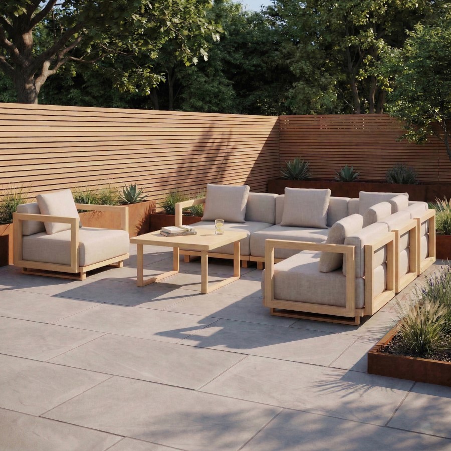 Designed to combine contemporary style with everyday outdoor comfort, this aluminium heat transfer outdoor sofa set creates the perfect space for relaxing or entertaining in your garden or patio. The spacious 235cm x 235cm corner layout offers generous seating, while the durable aluminium frame features a heat transfer finish that beautifully replicates the warmth of wood without the maintenance. Deep, supportive cushions provide exceptional comfort, inviting you to unwind with family and friends. A coordinating coffee table adds practicality for drinks and snacks, while the included protective furniture cover helps keep the set protected when not in use. Stylish, durable, and practical, this outdoor lounge set is ideal for modern outdoor living.