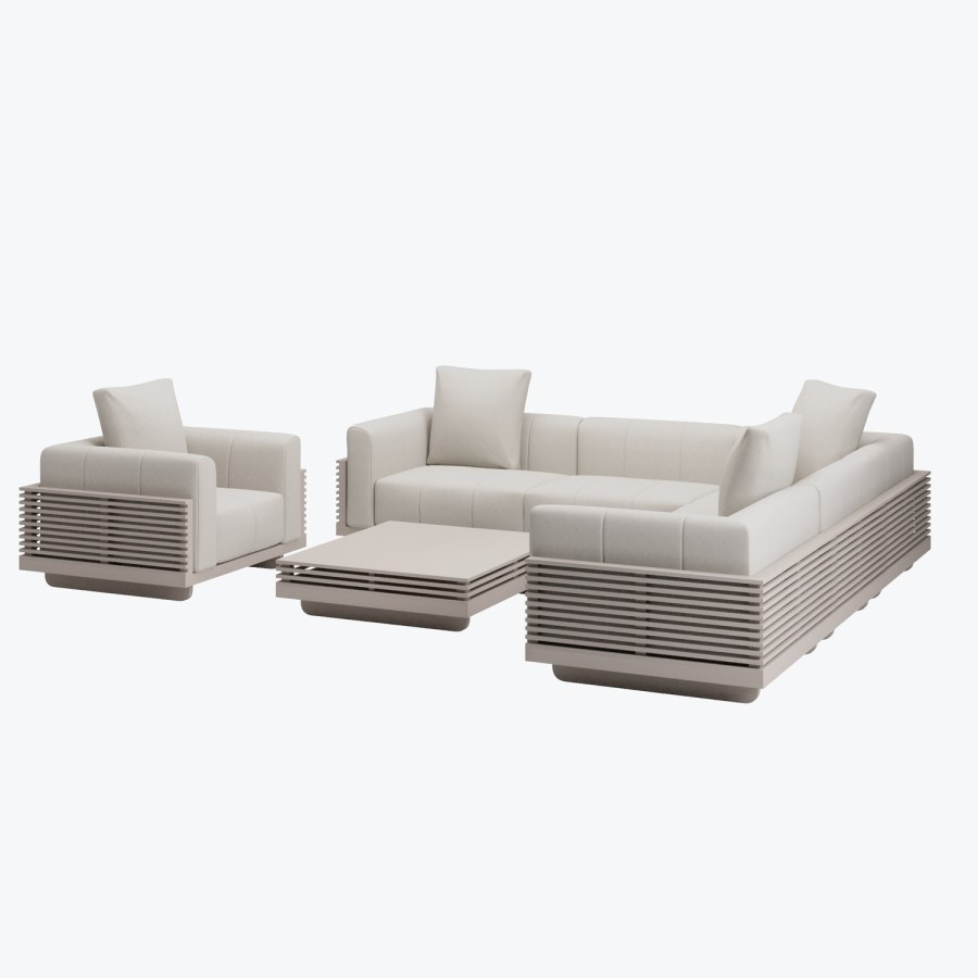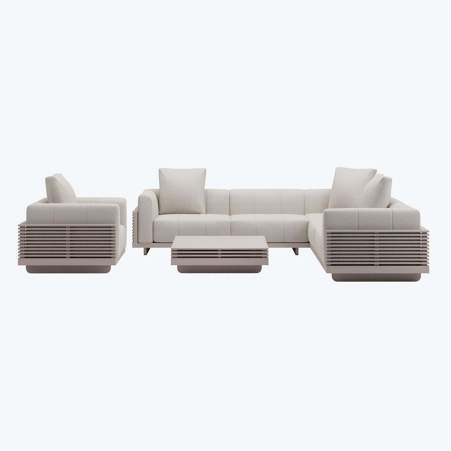 Transform your outdoor area into a luxurious open-air lounge with this large garden sofa set. Designed with generous proportions, the modular corner layout provides ample seating for family gatherings and entertaining guests, while the coordinating armchair offers additional comfort and flexibility. Deep-filled cushions ensure a supportive yet inviting sit, beautifully contrasted by the structured frame and distinctive slatted side panels. The low-profile coffee table completes the look with a modern layered base design, creating a cohesive and stylish centrepiece for your patio or decking. For added peace of mind, a protective cover is included to help safeguard your set from outdoor conditions when not in use, keeping it ready for your next gathering.Need to know