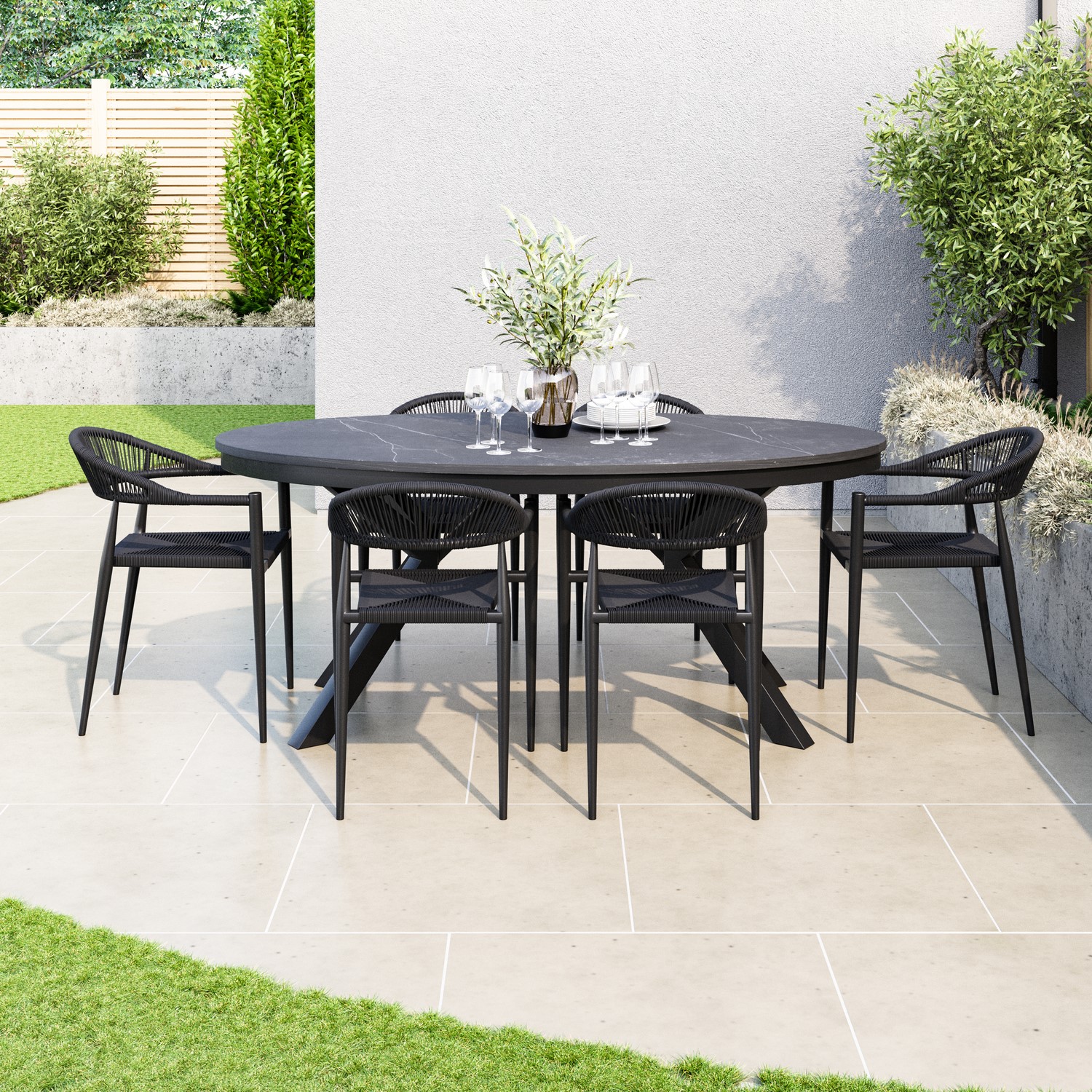 This sintered stone black garden dining set is designed to make outdoor dining both stylish and practical. The oval table creates a sophisticated focal point, offering ample space for meals and entertaining, while the six rope dining chairs provide comfortable seating with a modern, textured finish. The striking black colourway ties the whole set together, making it an ideal choice for contemporary patios, terraces, or garden dining areas where style and functionality go hand in hand.