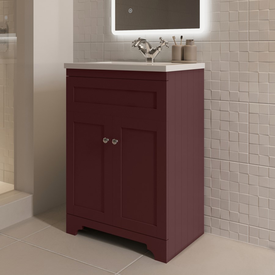 Transform your bathroom with this charming Baxenden freestanding 600mm vanity unit, finished in a classic matt burgundy. The traditional styling features classic tongue-and-groove side panelling, shaker doors and ornate front skirting details to add a feature piece to your bathroom. This floor standing vanity unit makes brilliant use of smaller bathrooms with its 600mm width whilst still providing ample storage with a shelved cupboard behind the soft close doors. This vanity comes with a ceramic inset basin, finished in a high quality white gloss to make cleaning a breeze and ensure durability. A predrilled tap hole is included, so you are free to add a mono basin mixer tap of your choice to match the included chrome handles and overflow. Check out our recommended accessories if you would like to upgrade your handles and overflow to another finish. While the unit is water-resistant, it isn't waterproof so we recommend wiping away any splashes or spills to help keep it looking its best and performing well over time.