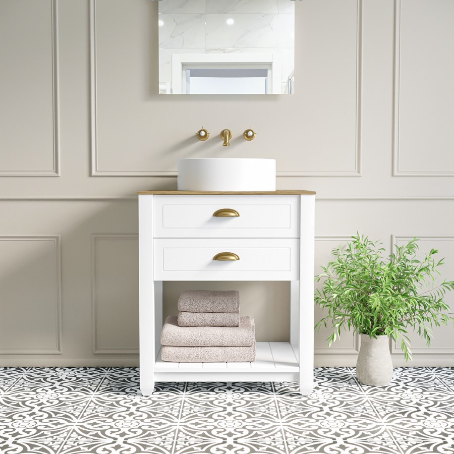 This timeless design will update your bathroom and be the perfect centrepiece with its matt white finish and wood effect top that makes the brushed brass cup pull handles pop. It has a traditional meets modern styling that will look great in any bathroom and the neutral white and black sits well in any colour scheme.