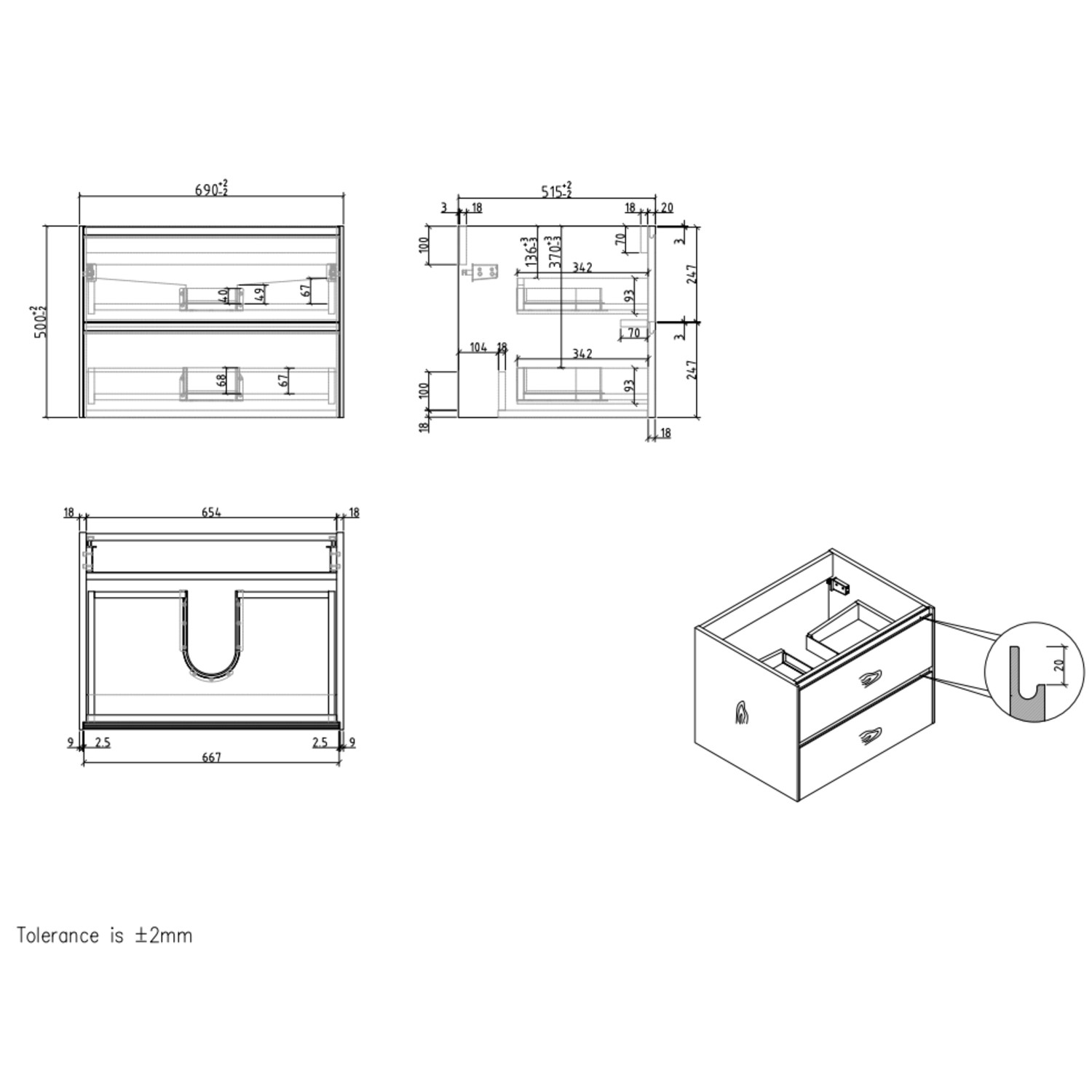 - Overall Dimensions: H 500 x W 700 x D 520 mm (Please note the main footprint of this vanity is W 690 x D 515mm – however the basin has a small overhang to slightly increase the overall dimensions)