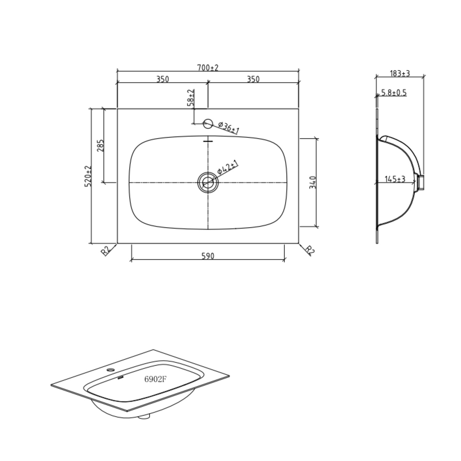 - Internal Basin Dimensions: H 145 x W 590 x D 340 mm