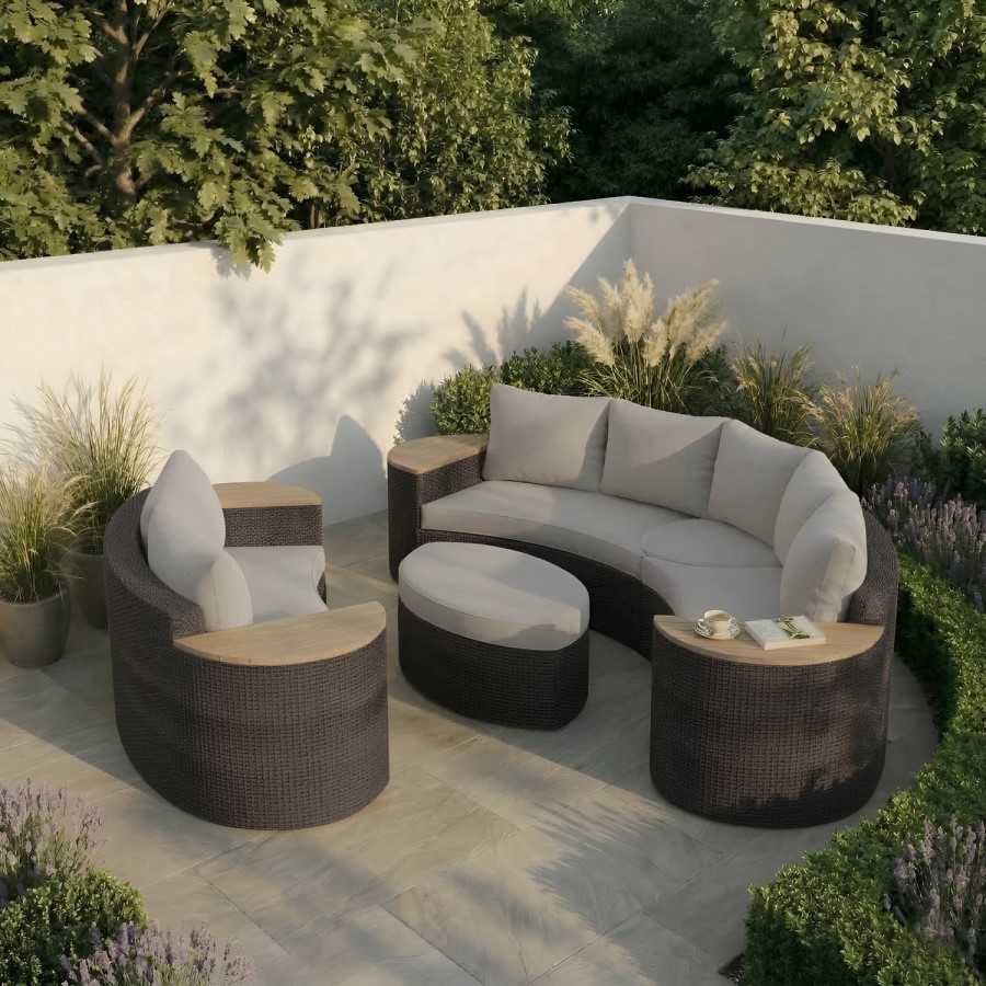 This large outdoor curved sofa set blends modern design with everyday practicality, making it a standout addition to any garden or patio. The sculptural curved silhouette not only enhances visual appeal but also creates a welcoming seating arrangement for gatherings. Finished in a rich dark rattan weave, the frame is built for durability while maintaining a sophisticated aesthetic. Complemented by generously padded, neutral cushions, this set ensures exceptional comfort for long afternoons outdoors. Integrated wooden side tables add convenience and style, while the coordinating armchair and ottoman complete a cohesive, functional outdoor living space.