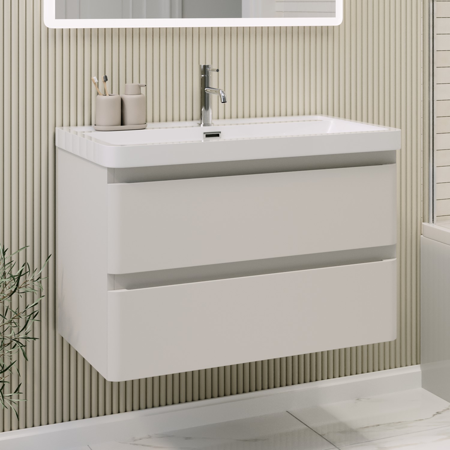 Maximise your bathroom’s floor space with this sleek, matt beige wall-hung 800mm vanity unit from the Pendle range. Its floating, wall-hung design creates a modern, minimalist look whilst adding extra floorspace and making floor cleaning effortless. This wall hung vanity unit is designed for convenience, featuring two spacious soft-close drawers with integrated handles, providing ample storage for your bathroom essentials. The unit’s elegant curves complement any contemporary family bathroom and pair perfectly with the Pendle toilet unit. This vanity unit includes a fitted resin basin with a gloss white finish for a fresh, stylish touch, which reflects light beautifully. This unit comes preassembled, all you have to do is simply secure the basin. Choose a basin mixer tap of your choice of finish to complete the look. Please note, the basin comes with a pre-fitted chrome overflow cover. While the unit is water-resistant, it isn't waterproof so we recommend wiping away any splashes or spills to help keep it looking its best and performing well over time.