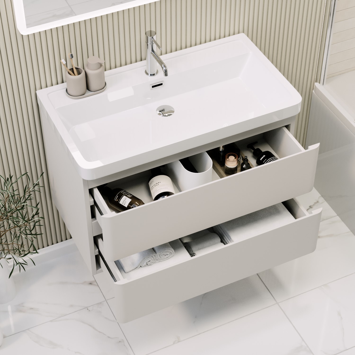 Dual Drawer Storage: Two seamless, handleless drawers provide generous space for organising bathroom essentials.