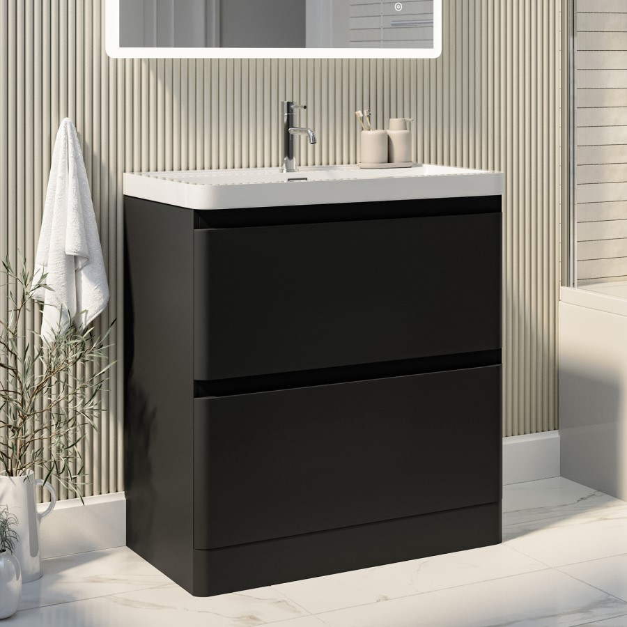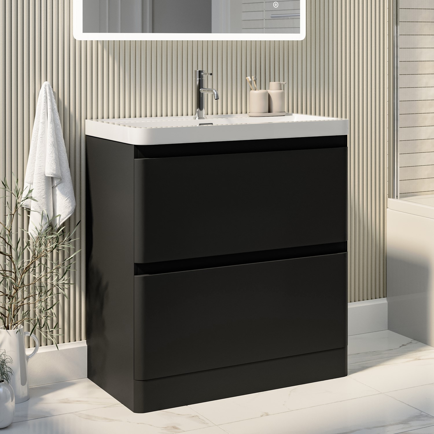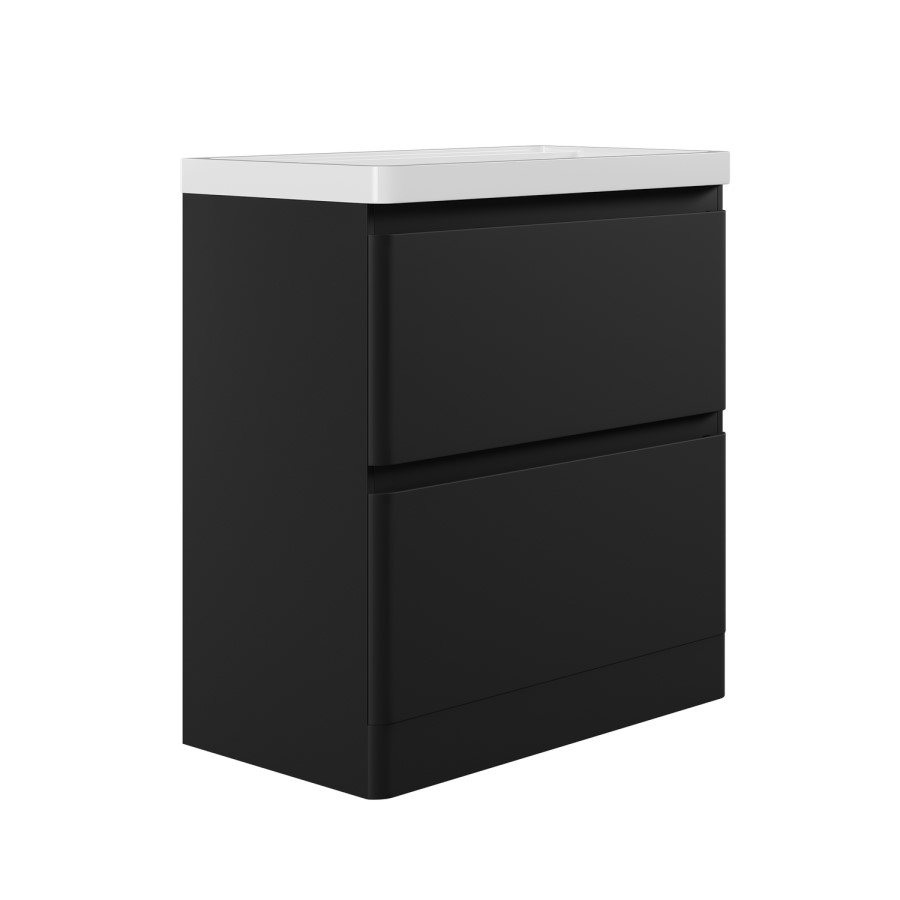 Give your bathroom a fresh, modern look with this sleek, matt black 800mm floor-standing vanity unit from the Pendle range. Designed for modern living, it offers a contemporary, minimalist look while providing a sturdy, space-saving solution. This freestanding unit features two deep, spacious soft-close drawers with integrated handles, ensuring ample storage for all your bathroom essentials while maintaining a seamless design. The extra height of the floorstanding design allows for deeper drawers, making it ideal for storing bulkier items and maximising vertical space. Its elegant curves complement any modern family bathroom and pair perfectly with the Pendle toilet unit.