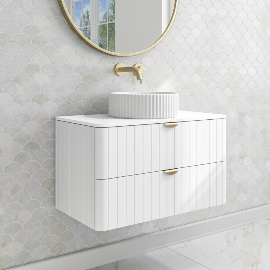 800mm White Wall Hung Vanity Unit with Marble Top Countertop Basin & Brushed Brass Handles- Empire