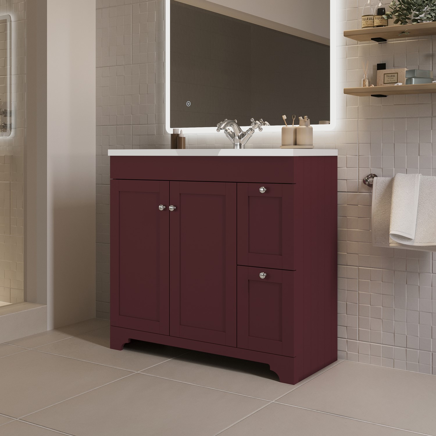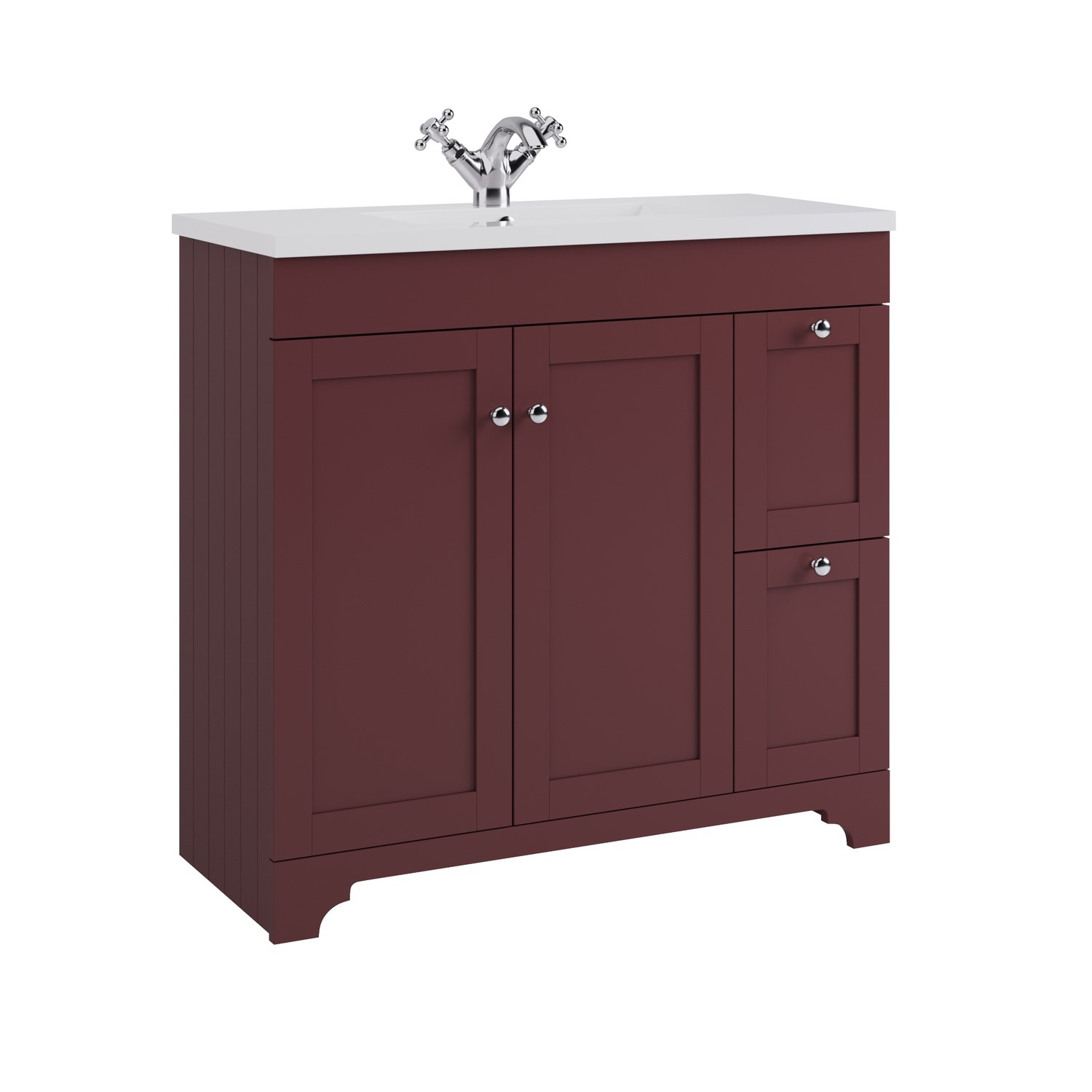 Transform your bathroom with this charming Baxenden floorstanding 900mm vanity unit, finished in a classic matt burgundy. The traditional styling features classic tongue-and-groove side panelling, shaker doors and ornate front skirting details to add a feature piece to your bathroom. This vanity unit makes brilliant use of larger bathrooms with its 900mm width and provides generous storage with a shelved cupboard behind the soft close doors, alongside two additional soft close side drawers for smaller toiletries. This vanity comes with a ceramic inset basin, finished in a high quality white gloss to make cleaning a breeze and ensure durability. A predrilled tap hole is included, so you are free to add a mono basin mixer tap of your choice to match the included chrome handles and overflow. Check out our recommended accessories if you would like to upgrade your handles and overflow to another finish. While the unit is water-resistant, it isn't waterproof so we recommend wiping away any splashes or spills to help keep it looking its best and performing well over time.