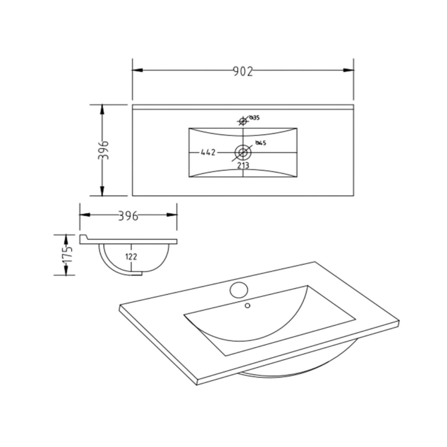 - Overall Basin Vanity Dimensions (including basin): H882mm x W902mm x D396mm