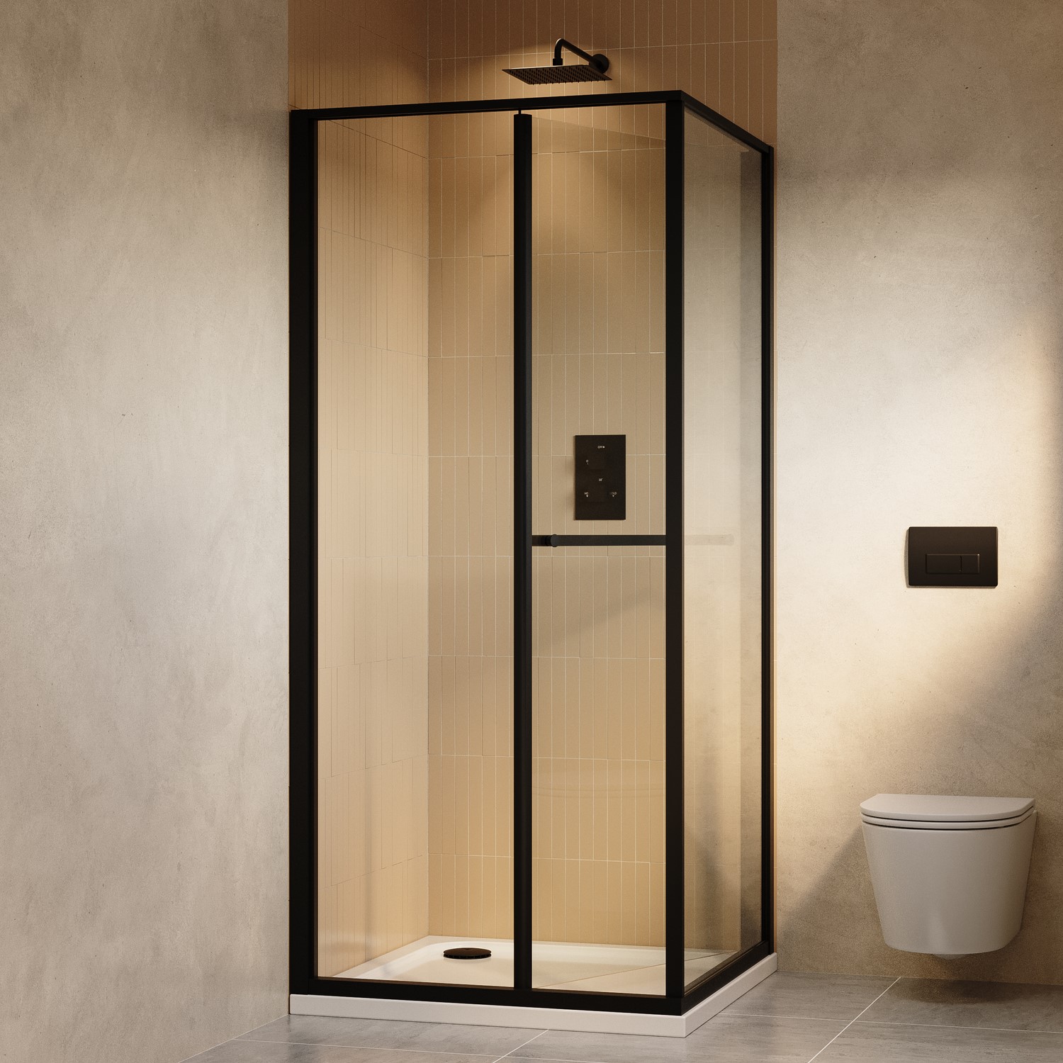 The 900 x 900mm Infold Shower Door with Towel Rail in matt black with shower tray is the perfect solution for compact bathrooms, thanks to its intelligent folding design and space-saving features. The standout feature is its construction — made from robust 6mm toughened safety glass that ensures both user safety and product longevity, and framed in corrosion-resistant, matt black aluminium for a clean and contemporary look.