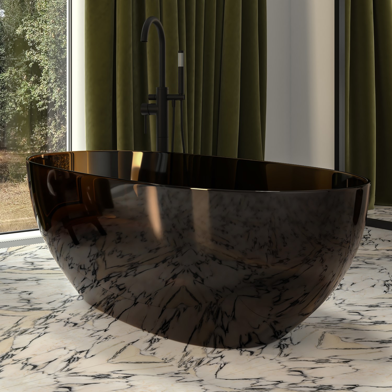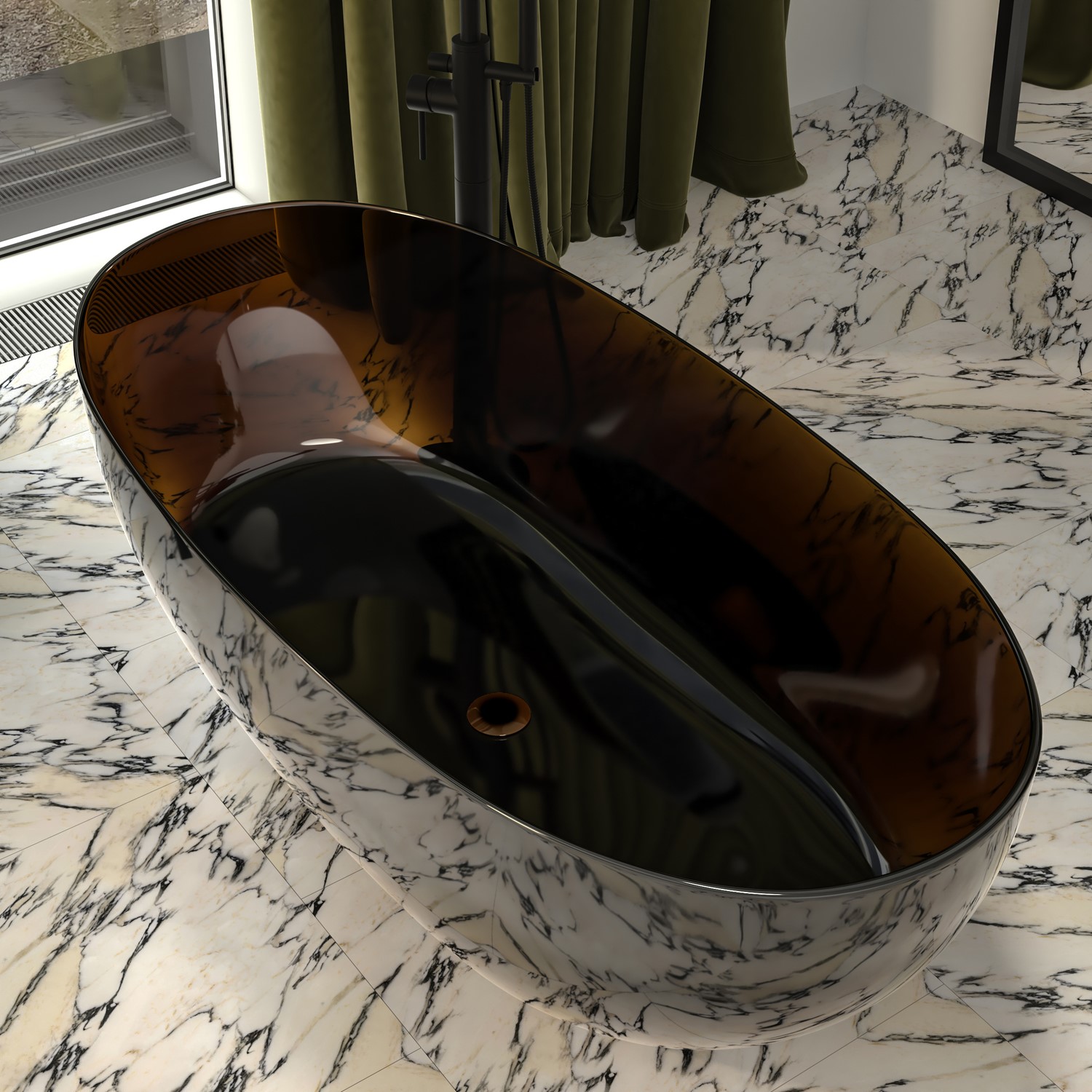 - Sophisticated Design - With its crystal-clear transparent resin construction and perfectly balanced silhouette, this freestanding bath delivers a strikingly modern aesthetic. The luminous amber surface captures and reflects light, creating an elegant, sculptural centrepiece that elevates contemporary bathroom interiors.