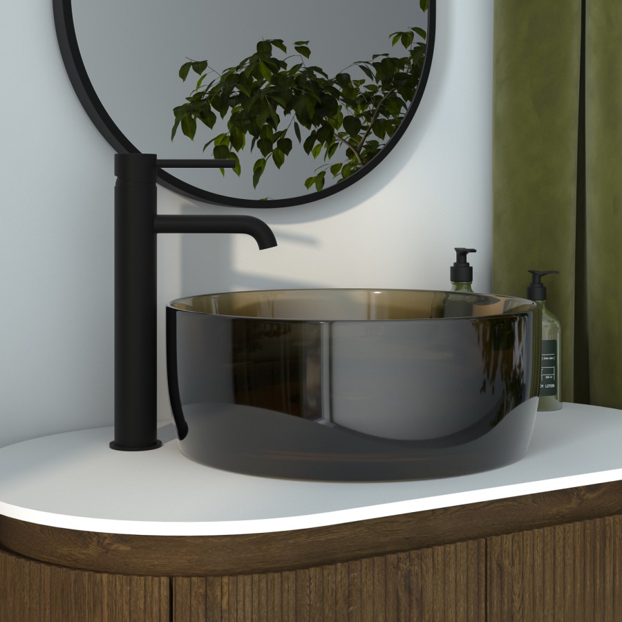 Experience refined luxury with the Aurea 400mm transparent resin countertop basin. Crafted from high-quality resin, its beautifully balanced silhouette and luminous surface capture and reflect light, creating a sense of openness, elegance, and modern sophistication. Each basin is meticulously handcrafted, resulting in exceptional clarity, a flawlessly smooth finish, and a surface that feels warm and inviting to the touch. The round design and translucent warm amber tone adds sophistication, while its robust build, featuring high-quality materials like aluminium hydroxide and acrylic resin, ensures lasting durability and comfort. The advanced resin composition also offers excellent thermal insulation, helping to retain heat and keep water warmer for longer, and is naturally hygienic and easy to maintain as the smooth integrally moulded surface resists dirt, water stains, and cracking for lasting beauty.