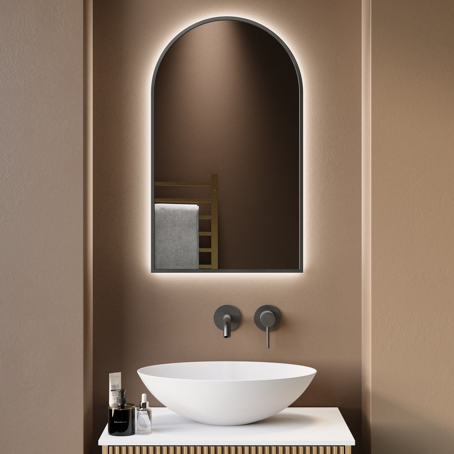 Upgrade your bathroom with this beautifully designed Empire arched backlit mirror with lights featuring a sleek gunmetal grey frame. Measuring 500x800mm, this small mirror is a smart choice for modern cloakrooms and bathrooms. The sleek 10mm gunmetal grey frame adds a modern, minimalist edge and provides a striking contrast that matches perfectly with other gunmetal grey bathroom fixtures. The soft backlit glow frames your reflection perfectly while offering practical lighting for everyday routines. The adjustable colour temperature allows you to switch seamlessly between warm white (3000K), natural white (4000K), and cool white (6500K) to complement any mood or activity. Our innovative dimmable feature takes versatility even further, letting you set the perfect brightness for any occasion. Start your day with bright, clear illumination for precise grooming and makeup application, then lower the intensity in the evening to create a calming, tranquil atmosphere. The built-in memory function automatically saves your preferred brightness and colour temperature settings, so your mirror remembers exactly how you like it every time you switch it on – no need to readjust with each use.