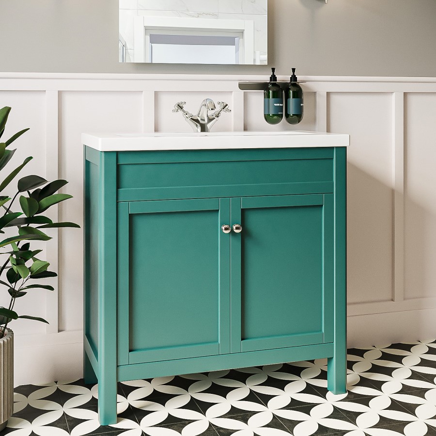 - Matt green shaker style freestanding vanity unit with a modern twist