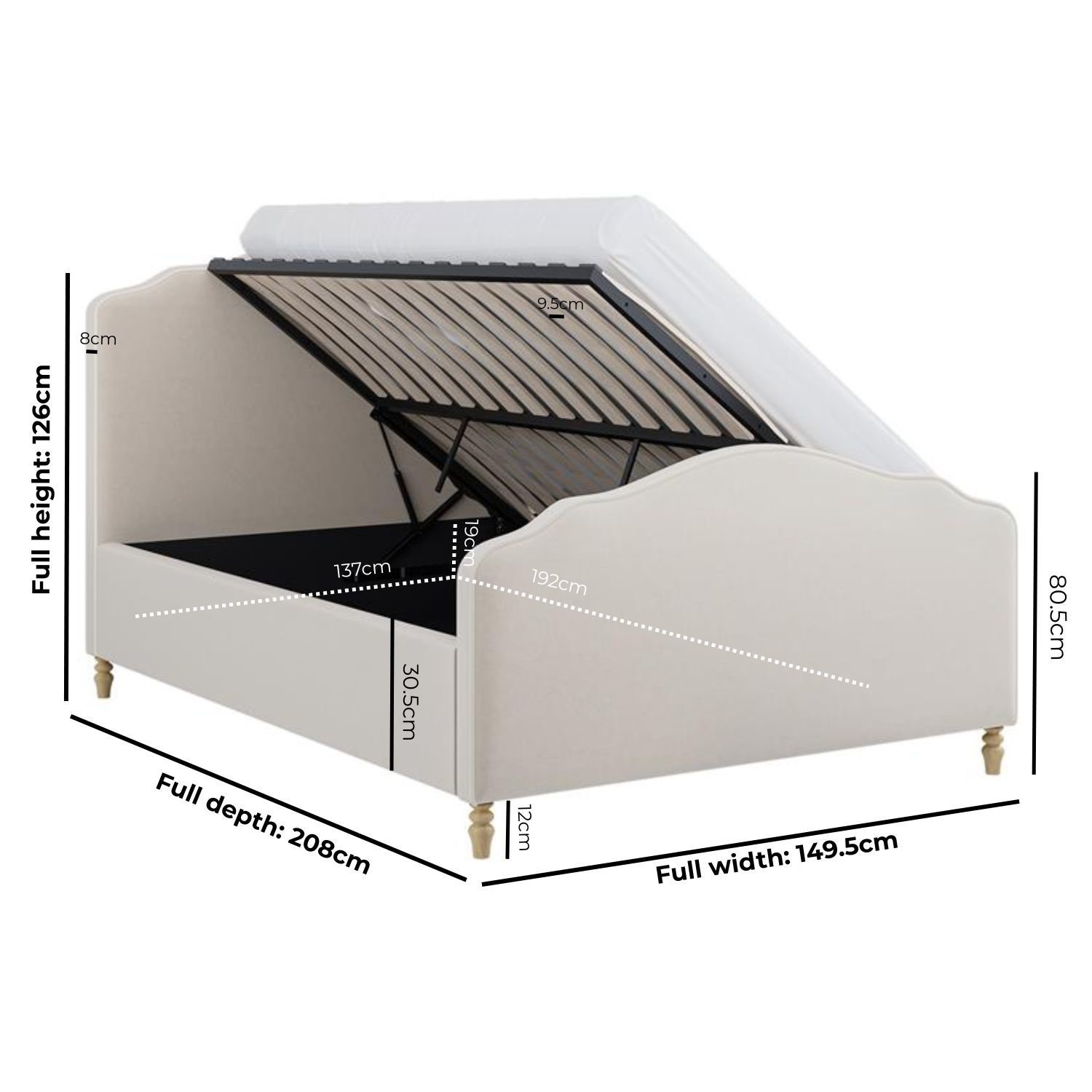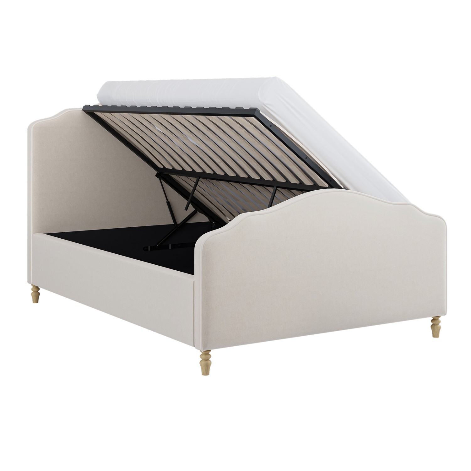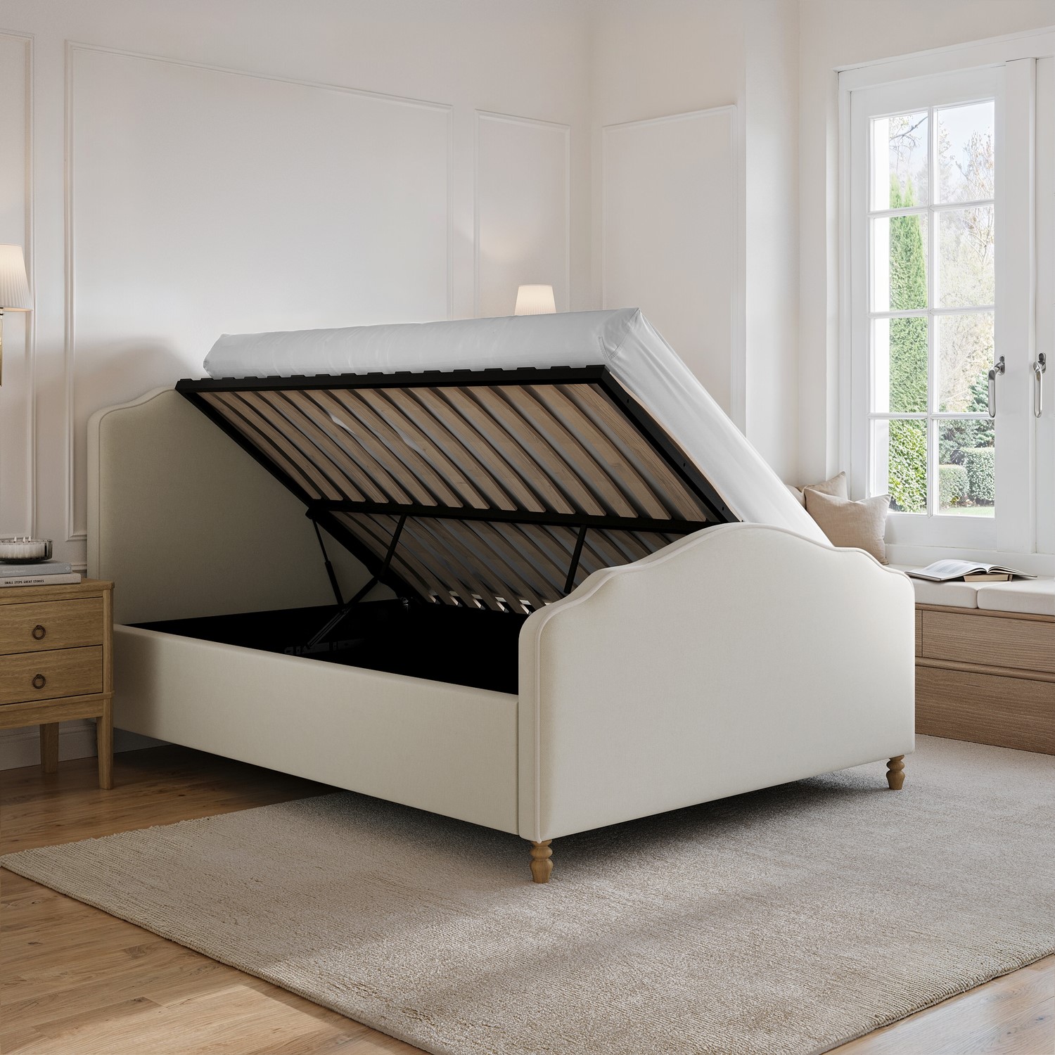 Elevate your bedroom with the Marie Bed, a refined blend of French-inspired elegance and modern practicality. Its arched, piped headboard and soft beige chenille upholstery create a warm, timeless focal point in any space. A smooth side-lift ottoman reveals generous hidden storage, perfect for linens, blankets, and seasonal essentials, and can be assembled during setup to open from either the left or right to suit your room layout. It has a solid storage base that keeps stored items protected, clean, and neatly organised. Its wooden sprung slatted base ensures enhanced comfort and support. Finished with turned beech wood legs, this bed offers enduring stability with a classic touch.